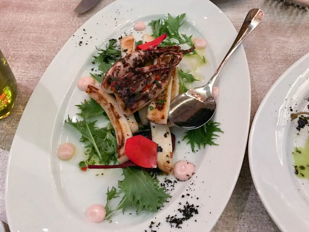 Ich bestelle einige Gerichte von der Karte, die in einem Klemmbrett gereicht wird, und dazu eine Flasche 2012er Trilogia (€ 84), der in dickwandigen, viel zu kleinen Gläsern serviert wird. Zu „hausgemachtem“ Brot – da dürfte man ruhig noch etwas üben – gibt es handelsübliche Oliven und eine rosafarbene, optisch an Zahnpasta erinnernde Substanz mit bissigem Knoblauchgeschmack.