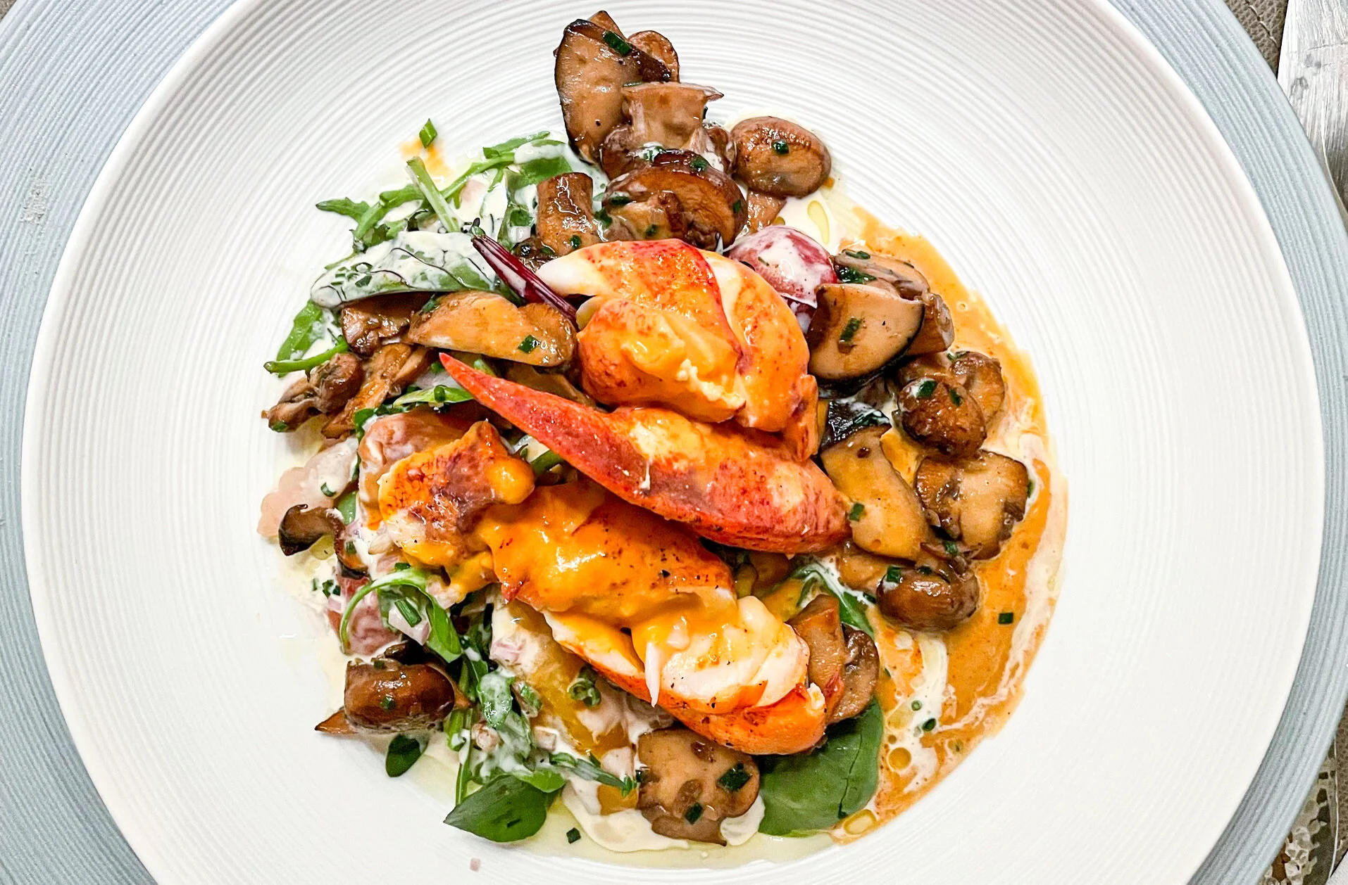 Der Salat vom lauwarmen Hummer mit gebratenen Pilzen und Mango (€ 48,50) ist von der ersten Gabel an zu einem Favoriten von mir geworden, mit Hummer von auffällig guter Qualität. Auch durch (behutsames) Aufwärmen des Krustentiers bleibt dies saftig, aromatisch und ohne Makel. Zusammen mit einer süßlich-süffigen Vinaigrette und den perfekt gewürzten gebratenen Pilzen ist das zweifellos ein Gericht, über dem ein Michelin-Stern auch zu Hause leuchtet. Auch in kleinerer, günstigerer Portion erhältlich, wie viele der Gerichte.