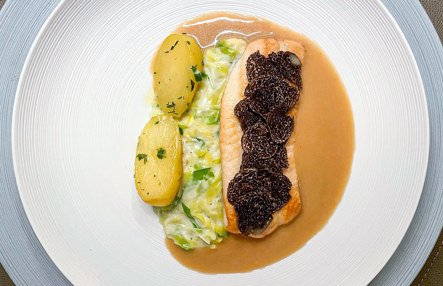 Bei der Seezunge mit Herbst-Trüffel, jungem Lauch und Sellerie (€ 58,50) schafft es sogar ein vorgegarter Fisch im heimischen Ofen zu respektabler Qualität. Der cremig eingekochte Lauch ist besonders schmackhaft, die Trüffeln intensiv und die Safran-Sauce dazu geradezu festlich.