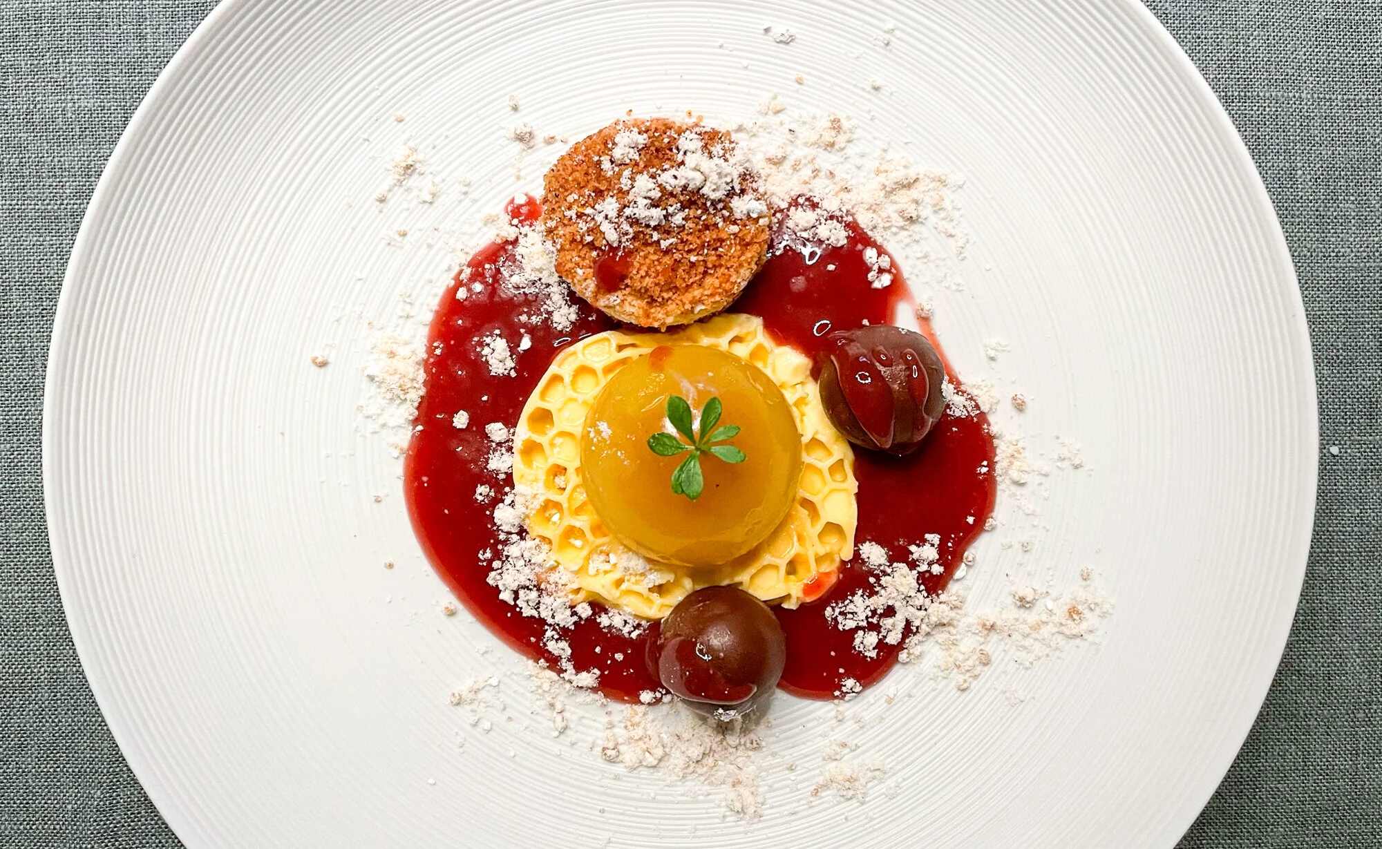 Das »Weihnachtsdessert« richtet man aus verschiedenen Komponenten selbst an. Es gibt Eis aus Zitrusfrüchten, eine Kirschsauce, flüssig gefüllte Schokoladenpralinen und weitere Zutaten, die in Summe ein fruchtiges, würziges Dessert ergeben. Ein gelungener Abschluss für ein überraschend hervorragendes »Mitnehm-Menü«.