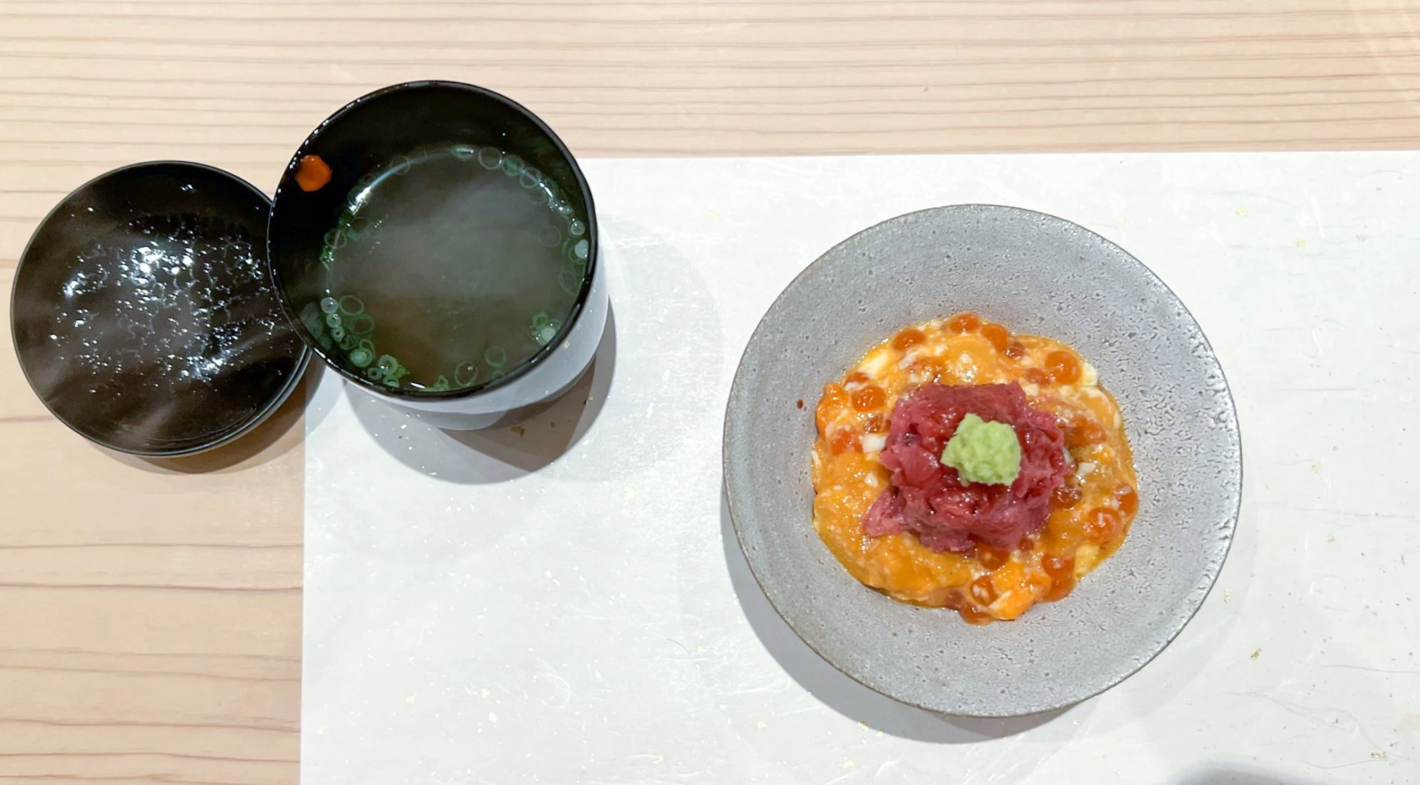 Nach dem Sushi folgt traditionell noch ein Reisgericht. Das ist immer der Moment, in dem man spätestens satt wird, sofern nicht längst geschehen. Und es ist der Moment, in dem der Meister oft noch mal einige seiner besten Zutaten hinzufügt. Den exzellenten Reis, der die Basis der vorherigen Nigiris darstellte, kombiniert Kimura-san hier mit Seeigel (uni) aus Hokkaido, Lachsrogen (ikura), Thunfisch (maguro) und frischem Wasabi. Das Zusammenspiel der Zutaten ist intensiv und vielschichtig und in Kombination mit einer Miso-Suppe auf beruhigende Art wohltuend. (8/10)