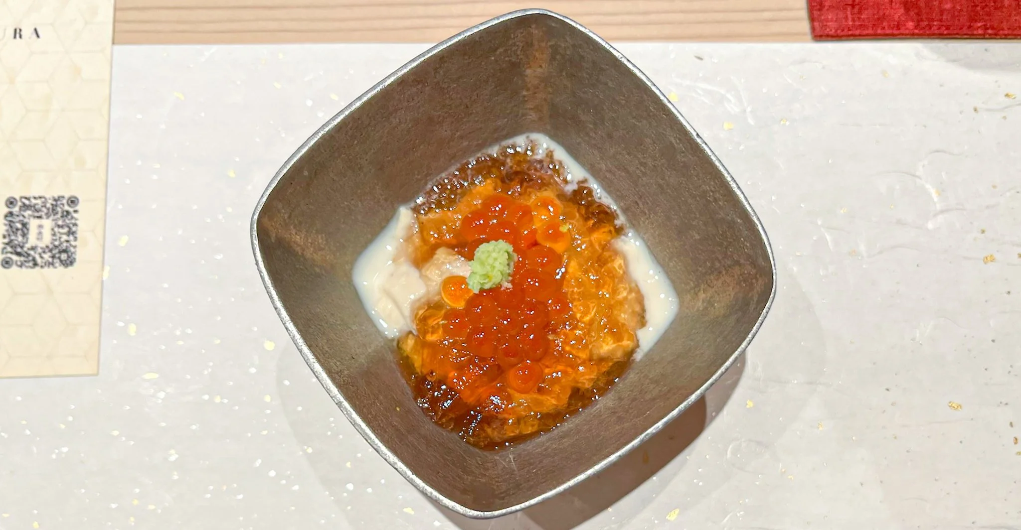 Zum Auftakt gibt es eine Kreation mit Lachsrogen (ikura), Dashi-Gelee und Milchhaut (yuba). Frisch geriebener, duftender Wasabi setzt dabei einen scharfen Akzent zu eleganter Kühle und frischer Herzhaftigkeit. Ein hervorragender Start. (8/10)