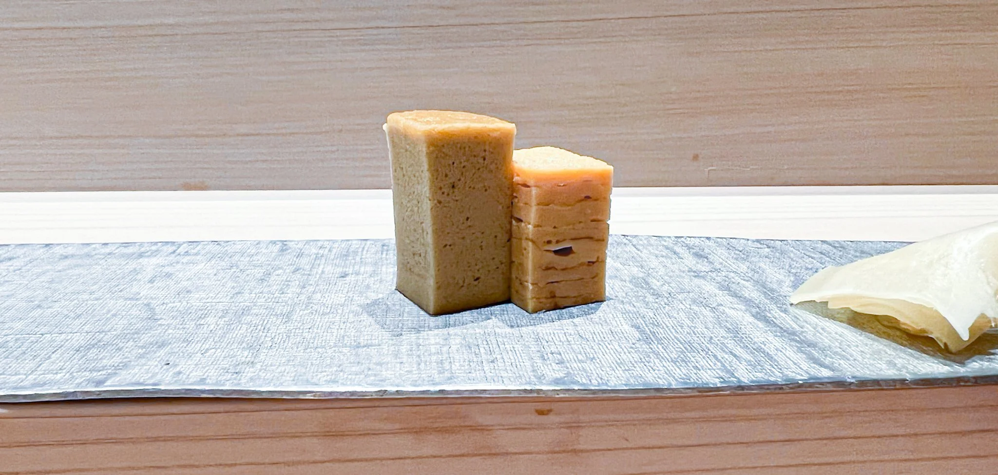 Der erste Menüabschluss präsentiert zwei verschiedene Versionen von tamago (Omelette): einmal in einer süßlichen Variante, wie sie in Tokio üblich ist und die ich hier leicht präferiere, sowie in einer herzhaften, wie man das eher in Kyoto pflegt. Die beiden Quader sind wie zwei Wolkenkratzer nebeneinander angerichtet. Dass man sich hier gleich zwei Varianten dieser aufwändigen Zubereitung zutraut, ist respektabel – dass beides auch noch so gut gelingt, eigentlich einen Applaus wert. Exemplare von den ganz großen Sushi-Meistern sind dagegen meist noch »dichter« und saftiger. (7/10)