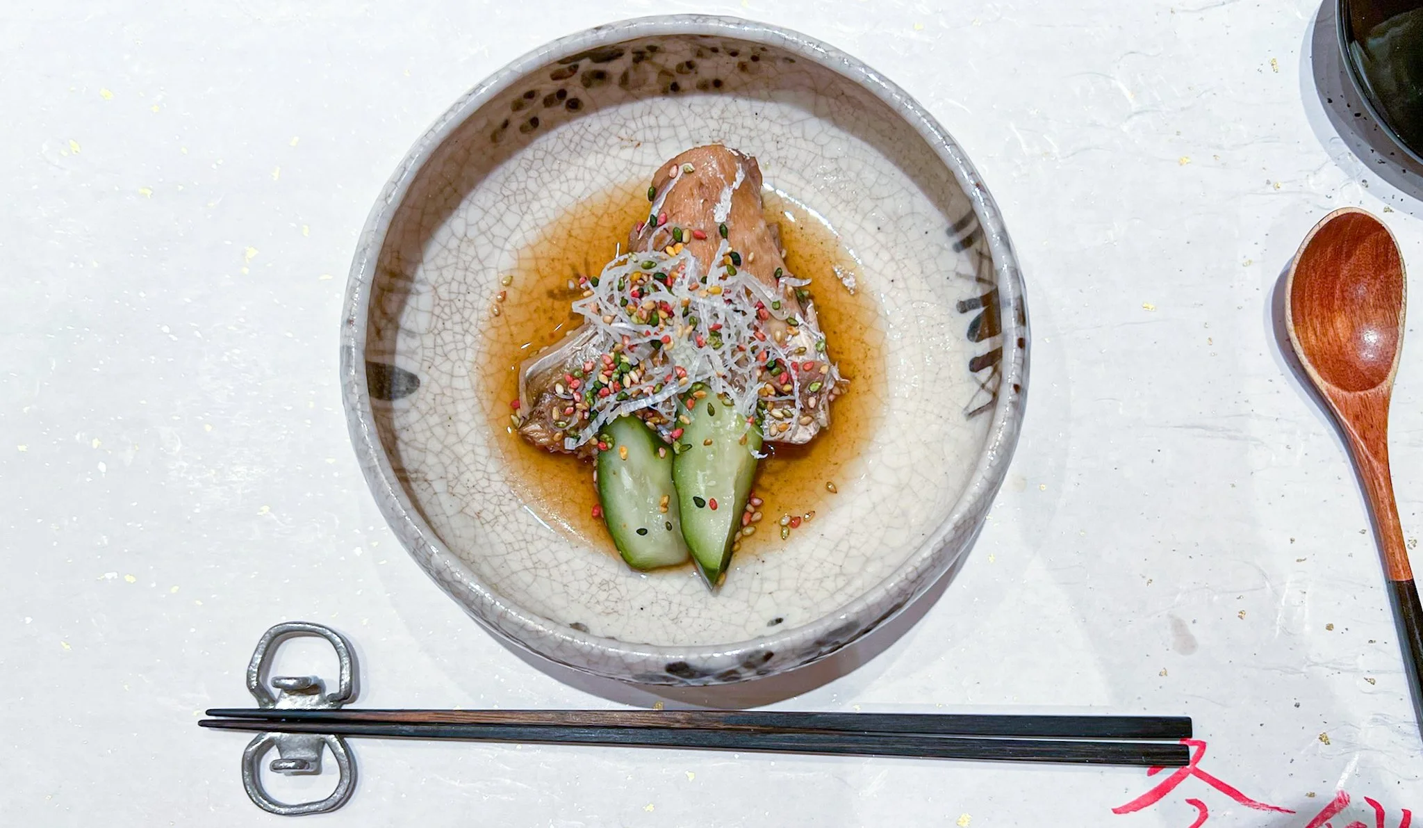 Die zweite Speise ist genauso fein. Es gibt ein saisonales Chawanmushi mit Krebsfleisch aus Hokkaido und shirako (Fischmilch), der etwas gewöhnungsbedürftigen, aber angenehm cremigen Delikatesse aus dem Samen männlicher Fische. Die unterschiedlich weichen Texturen sind spannungsvoll am Gaumen, dazu ergibt sich ein mild-würziger Geschmack. Die Hitze der Speise ist dabei essenziell, um ihren herzhaften Charakter zu unterstreichen. Erneut exzellent. (7,9/10)