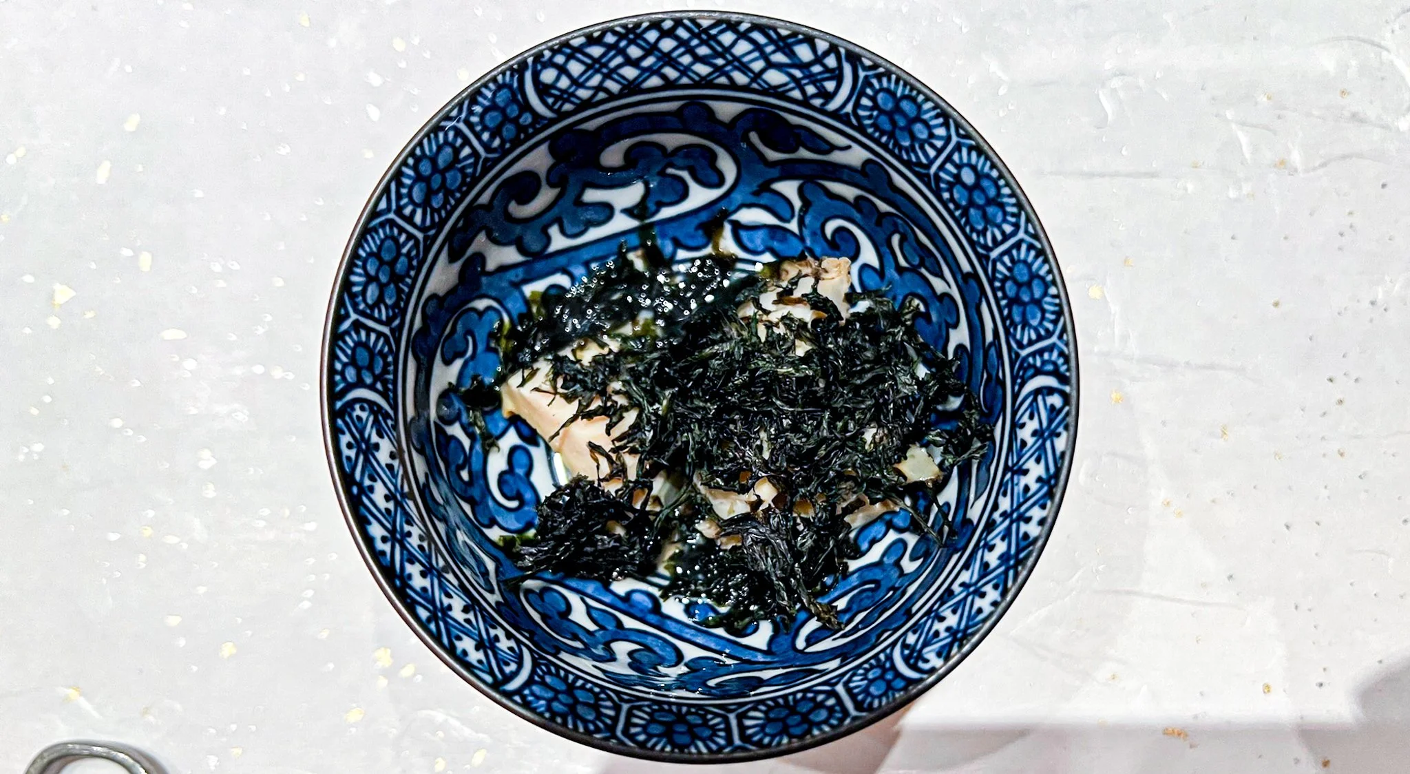 Es geht weiter mit einem Stück gekochter Abalone aus Hokkaido. Wer mit den Ausführungen dieser Zutat in den besten Restaurants Japans vertraut ist, weiß um das hohe kulinarische Niveau, das dieses kleine Stück Meeresschnecke erreichen kann. Deren wesentliche Attribute, wie eine bissfeste Textur und ein milder, leicht süßlicher Geschmack nach Meer – eigentlich das Gegenteil einer Auster –, können mit gewissenhafter Technik (Garung und Schnitt) und einer passenden Begleitzutat optimal herausgearbeitet werden. Hier bei Küchenchef Tomoo Kimura sind Qualität und Handwerk makellos. Seine Wahl, in dünne Streifen geschnittene Algen dazu zu servieren, ist schlüssig, überlagert aber in der gewählten Menge ein wenig die Aromen der Abalone, anstatt sie nur zu akzentuieren. Bis auf diese leichte Dysbalance ist aber selbst dieses kleine Schälchen ganz und gar hervorragend. Das Qualitätsniveau hier ist ausgesprochen hoch. (7,9/10)