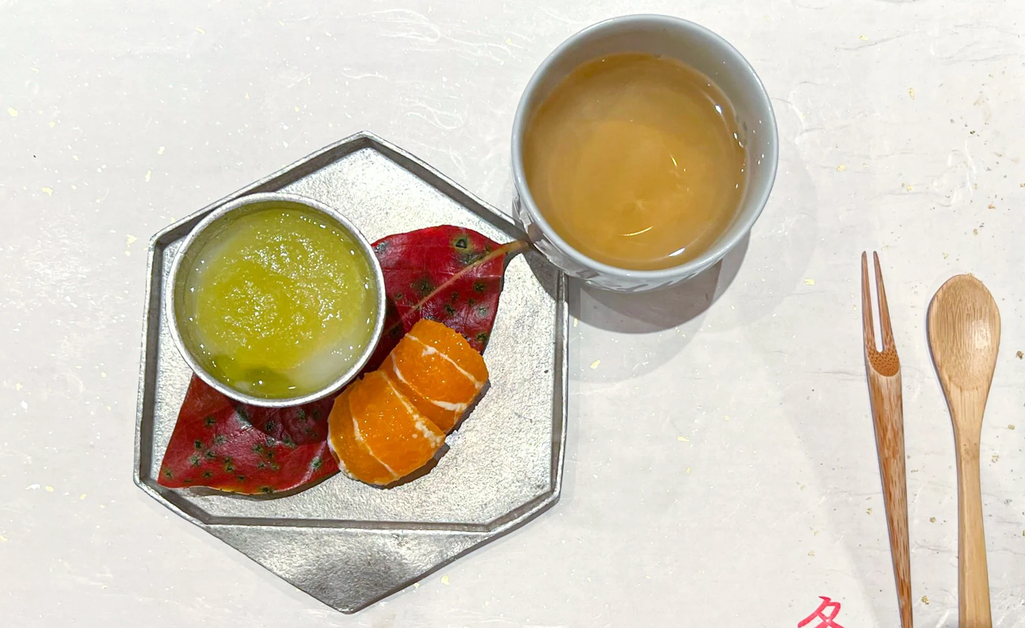 Das fruchtige Finale des mit anderthalbstunden auch zeitlich optimal gestalteten Mittagsmenüs besteht aus einer Kreation mit Melone in unterschiedlichen Zubereitungen – unten eher dicklich, wie die Süßspeise Mochi, obenauf ein kompottähnliches Püree, beides zurückhaltend gesüßt – sowie einigen Stücken fabelhafter Mandarine. Von Letzterer serviert man nicht einfach ein paar Spalten, vielmehr schneidet man die Frucht so zurecht, dass sie von möglichst vielen Häuten befreit ist. Das ergibt »kantigere« Stücke und ein deutlich angenehmeres Mundgefühl als wenn man die Spalten der Zitrusfrucht bloß an ihren natürlichen »Sollbruchstellen« trennte. Details, die begeistern. (7,9/10)