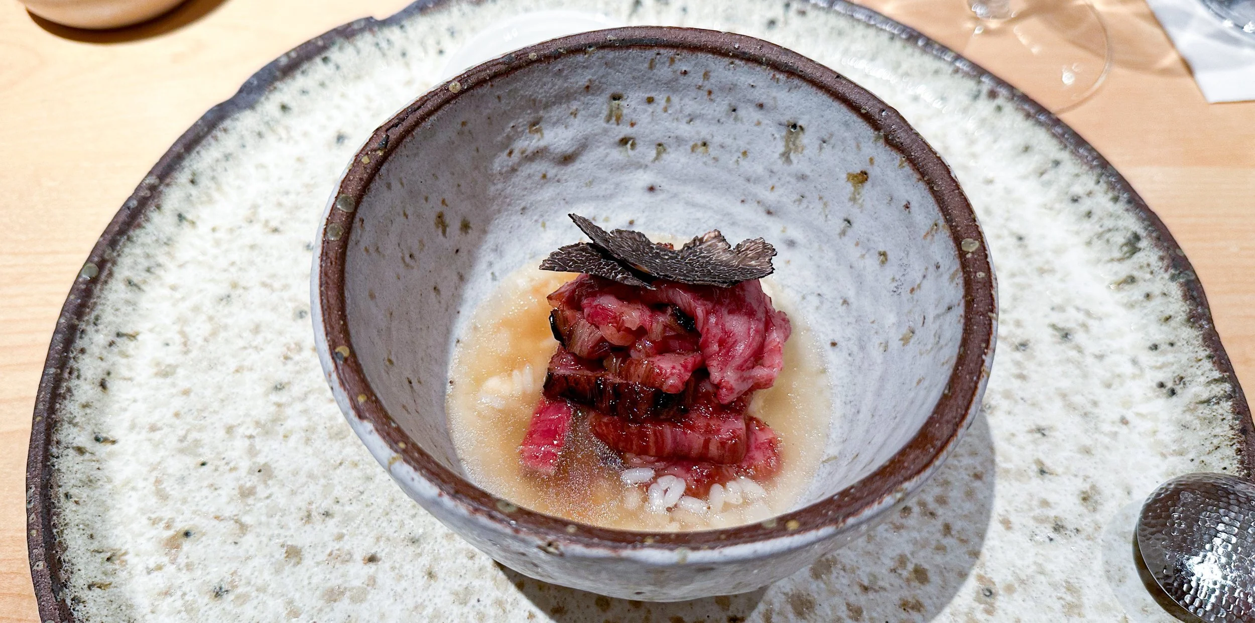 Das von mir gewählte Menü-Add-on duftet bereits so vielversprechend wie es klingt und aussieht. Edles Miyazaki-Rind ist in Form von nahezu rohen Scheiben in einem Schälchen mit Reis und einem Sud aus Blumenkohl und Rinderfett angerichtet. Sehr hochwertiger spanischer Wintertrüffel vollendet das luxuriöse Intermezzo, das von Hitze, dem Schmelz des Rindfleischs und der Textur des Reis lebt. Das Fleisch gart in dem heißen Sud noch etwas nach, sodass man verschiedene Gargrade erleben kann, theoretisch, denn diesem Genuss kann ich nicht allzu lange widerstehen. (8/10)