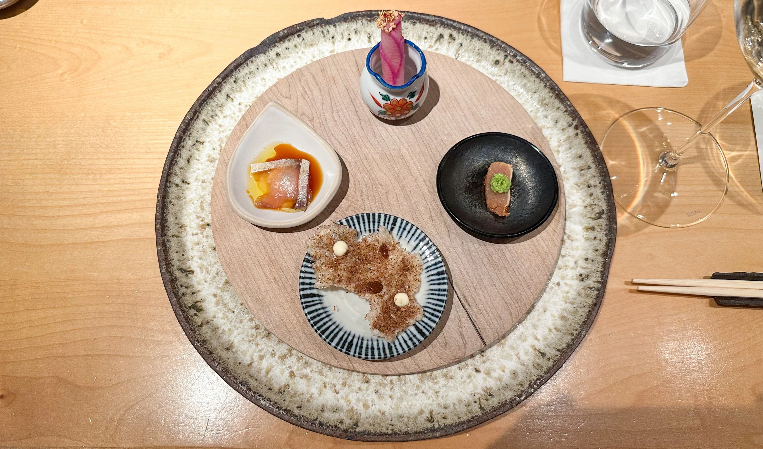 Die Weinkarte ist kompakt, aber sehr gut und akzeptabel bepreist. Den Anfang macht ein 2018er Chablis Grand Cru »Les Preuses« von der Domaine William Fèvre (165 €). Dazu gelangt ein optisch ansprechendes Vorspeisenquartett an den Tisch. Bereits die Präsentation, mit hübscher Keramik und wertigem Holz, gepaart mit einem leicht säuerlichen Duft nach Umami und Sojasauce, löst ein beruhigendes Gefühl des Angekommenseins aus, das ich nur von japanischen Restaurants kenne.