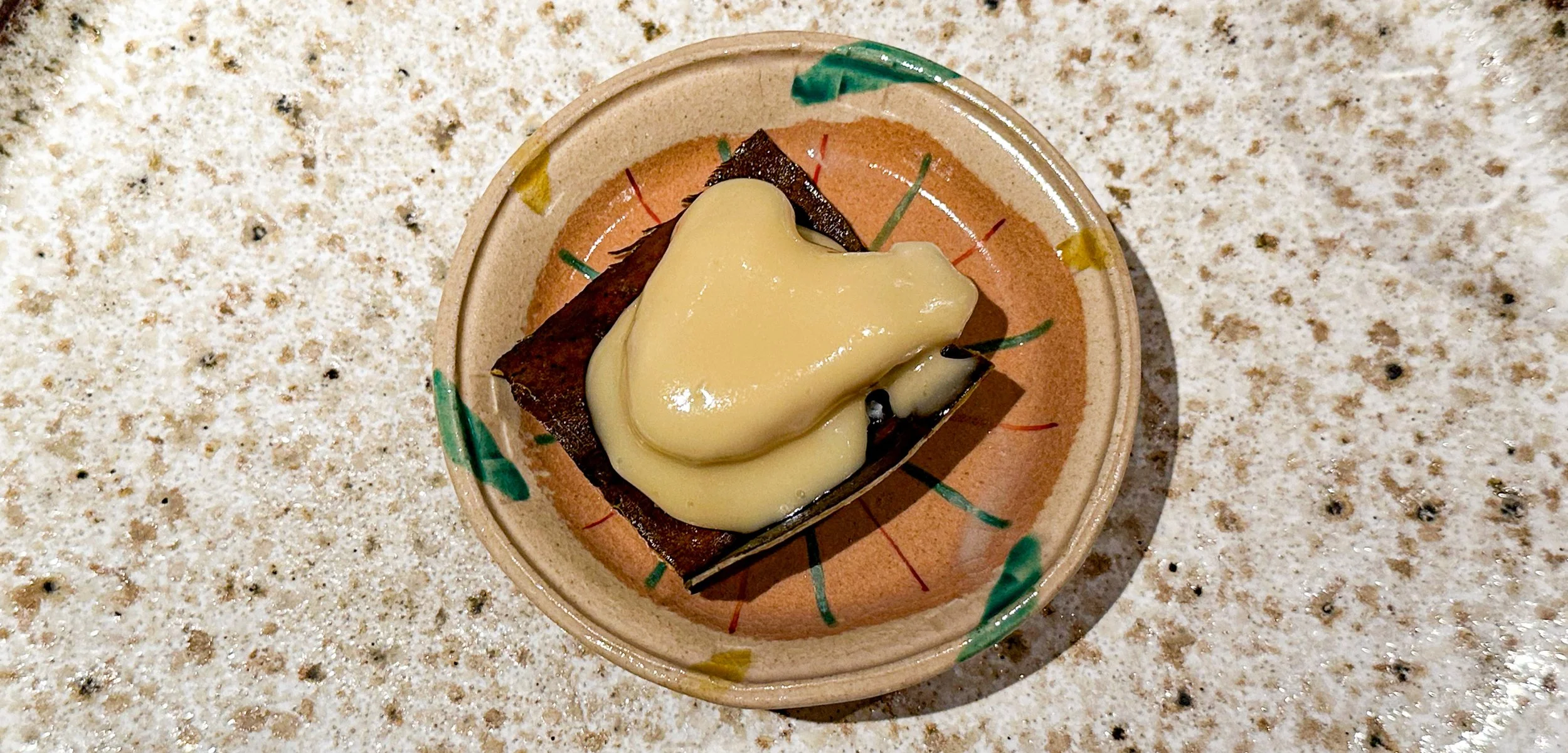 Gerollter Daikon ist mit Yuzu und Sesam aromatisiert und begeistert unmittelbar durch das filigrane, florale Aroma der japanischen Zitrusfrucht; eine Scheibe Kabeljaurogen schmeckt intensiv und erinnert an Bottarga; ein Reiscracker mit Furikake und Mayonnaise ist würzig und luftig-knusprig; gebeizte Holzmakrele mit Öl und Sojasauce präsentiert ein Produkt von hervorragender Qualität. (7,5/10)