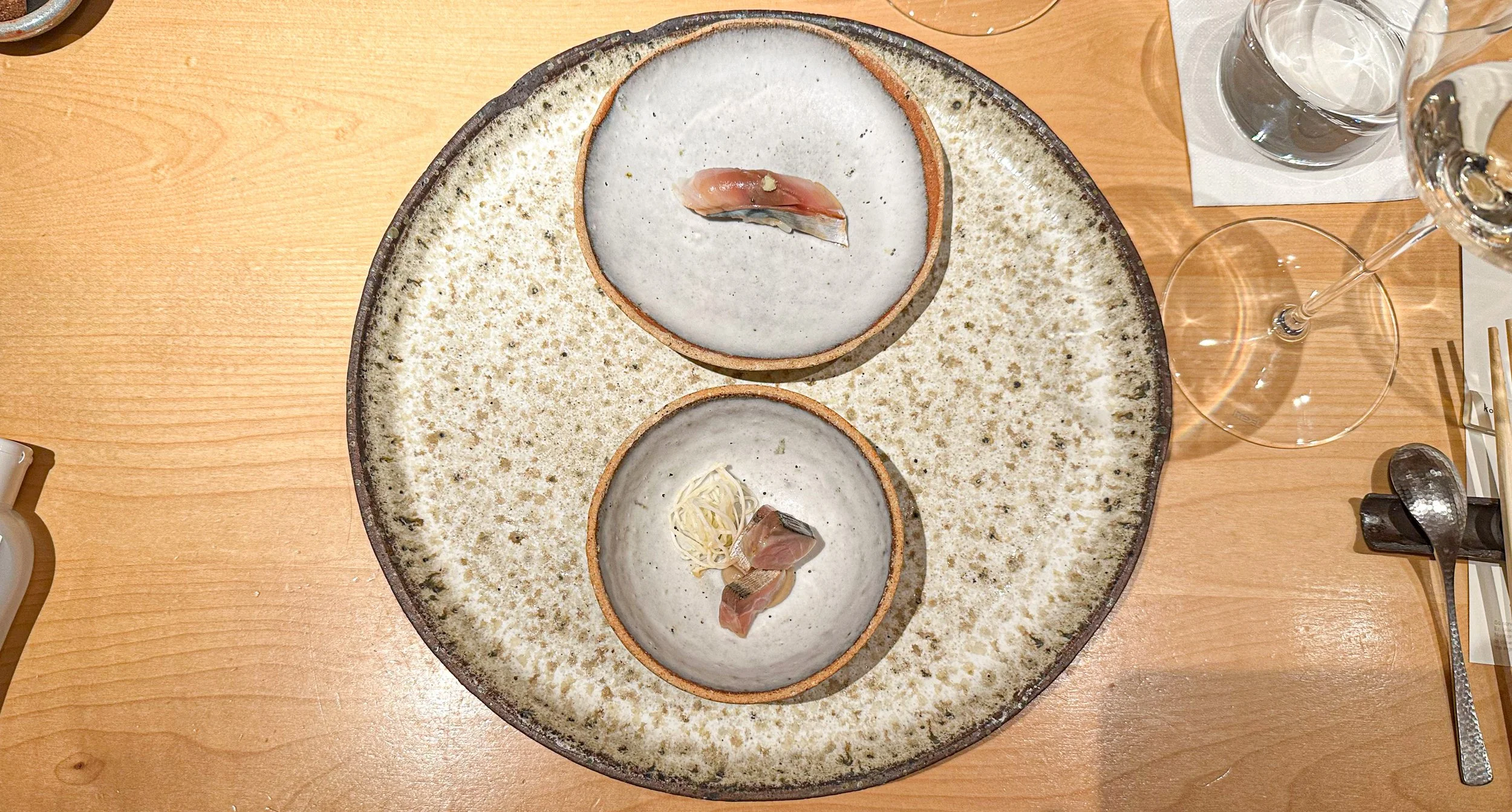 Es folgt Saba, Makrele, in zwei Zubereitungen. Die hübschen Schälchen halten einmal ein Nigiri bereit – mit buttrigem Schmelz, leicht rauchigem Aroma, angenehm handwarmer Temperatur und erneut exzellentem Reis –, sowie zwei behutsam über Holzkohle gegrillte Stücke des Fischs, kombiniert mit Selleriefäden und einer cremigen, würzigen Sauce. Sehr gut. (7/10)