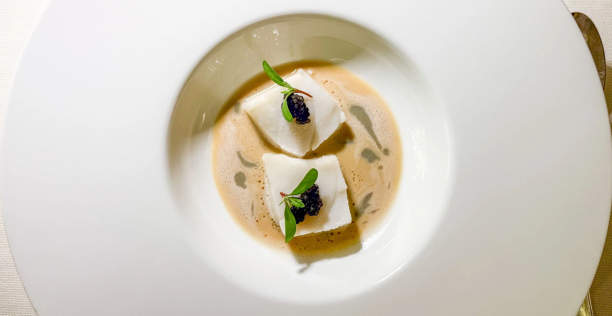 Meine nächste Wahl fällt auf ein kleines Zwischengericht mit gedämpftem Felsenbarsch mit Champagnersauce, Austerncreme und Kaviar (34 €). Der Fisch hat eine feste Konsistenz, die Sauce ist salzig, cremig und dicht. Das ist sehr gut, aber durch den alleinigen Fokus auf Salzigkeit auch nicht mehr. (7/10)