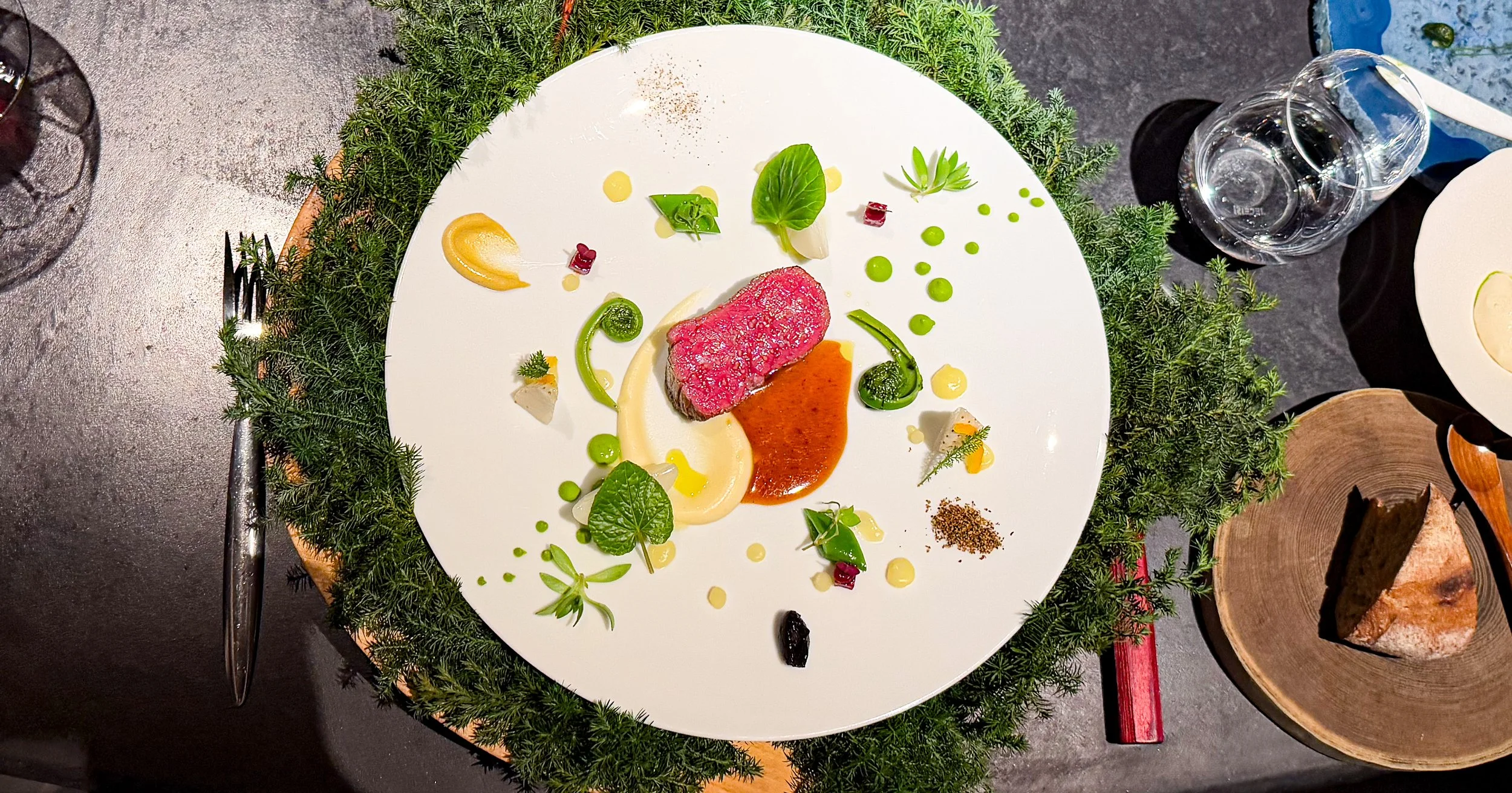Ich taste mich voran, kombiniere das butterzarte Rind mit leicht nussigem Straußenfarn, knackig süßen Zuckerschoten und erdigen Rübchen, mit intensiven Kräutern und mit einem Stück weißer Erdbeere, deren dezente Fruchtigkeit sich nahtlos in das Ensemble einfügt. Ein makelloser, klassischer Jus und eine Sauce aus Sobanudeln (!) erlauben immer wieder auch »klassisches Schlemmen«. Und während all das meisterhaft komponiert ist, fehlt mir persönlich ein letzter, kleiner Salz-Akzent auf dem Fleisch. So bleibt es bei einer großartigen, nahezu perfekten Komposition, die die Zerbrechlichkeit und Schönheit der Natur widerspiegelt – großartig! (9/10)