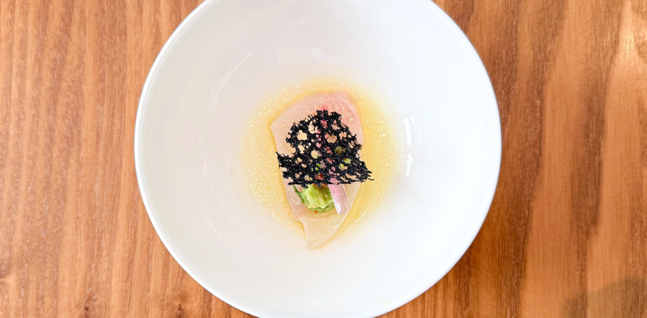 Die zweite Petitesse setzt gleich nach – und wie! Der vorherigen (eleganten) Rustikalität weicht mit einer Tranche Gelbschwanzmakrele, die in einem Sud von gelber Paprika mit Avocado und roter Zwiebel angerichtet ist, einem regelrecht japanischen Duktus. Der betörende Schmelz der Makrele, die elegant maritimen Aromen, die fein balancierte Säure und die ideale Temperatur: das ist schlicht hervorragend. (8/10)