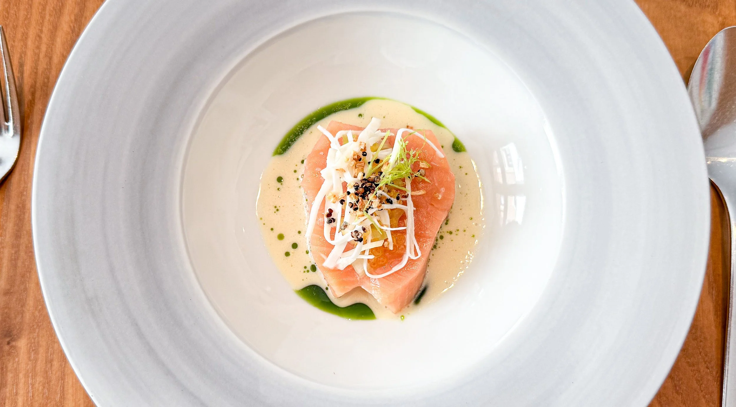 Bei aller Freude über die kulinarische Finesse, überrascht die recht nüchterne Stimmung im Restaurant. Der Service ist korrekt, aber reserviert, das Interieur gepflegt, aber etwas bieder, der Altersdurchschnitt der Gäste hoch, die Konversationen gedämpft statt lebendig. Ich lasse mich von der guten Laune an meinem Tisch zwar nicht abbringen, aber so etwas wundert mich immer – es bleibt ein sehr deutsches Phänomen.