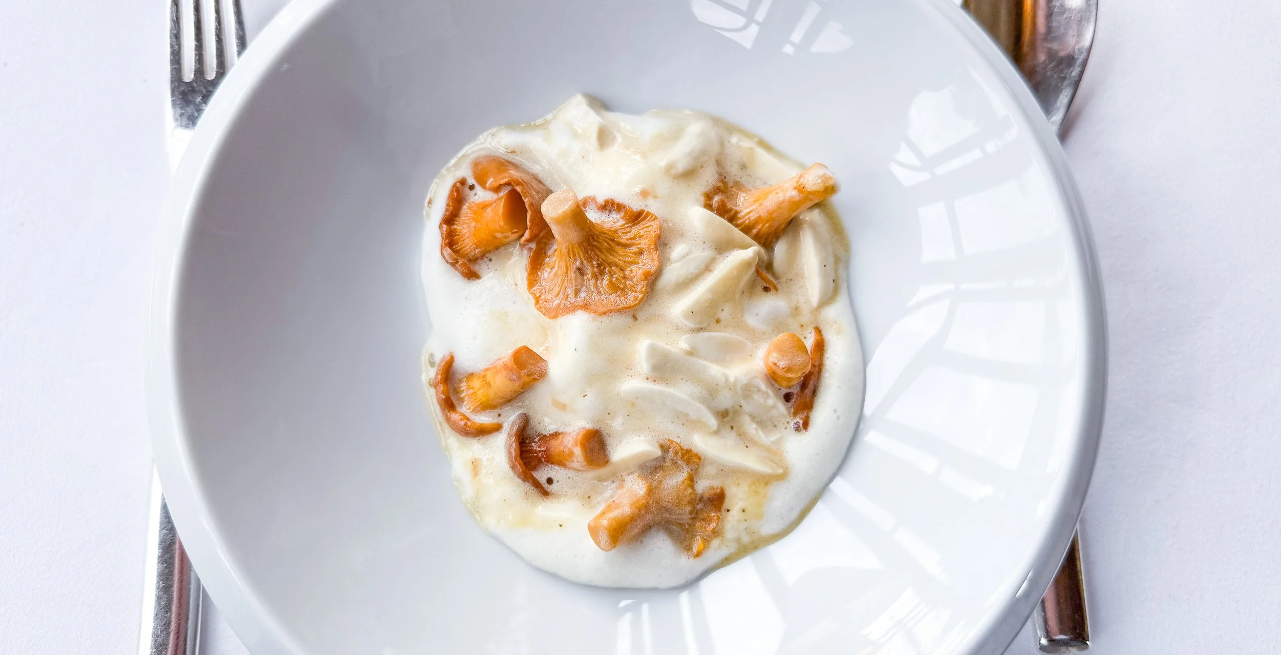 Die eben erlebte Leichtigkeit wird im nächsten Gang wieder aufgegriffen. Serviert wird eine kleine Cassolette (ein Schälchen) mit wilden Pfifferlingen aus der Sologne, gebettet auf einem luftigen Schaum aus frischer Mandelmilch und Estragon-Chlorophyll. Am Gaumen wirkt das wie eine Wolke: warm und weich, während die aromatischen, in Butter gegarten Pilze und die knackigen Mandelstifte feine Kontraste setzen. Das alles schmeckt elegant nach Wald; der Estragon verleiht eine fast ätherische Frische. Überraschend originell – und erneut absolut herausragend. (10/10)