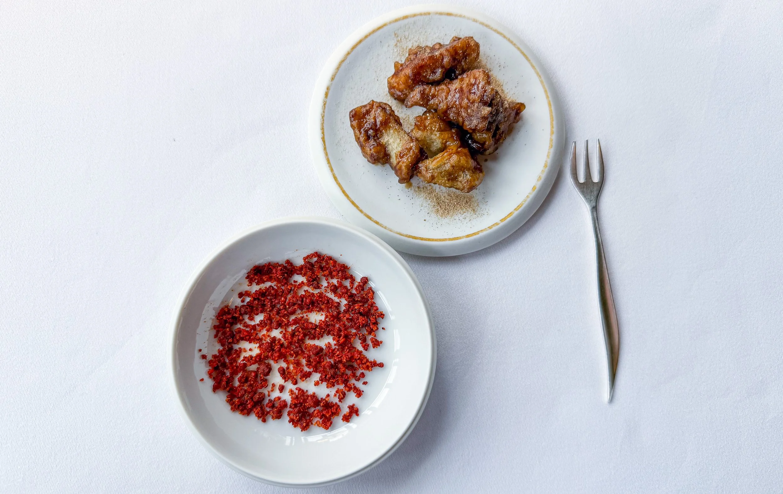 Die zweite Kleinigkeit wirkt zunächst schlichter, offenbart aber raffinierte Tiefe: knusprige Champignon-Beignets mit milder Essigsauce und einem hausgemachten Satay-Gewürz von leuchtend roter Farbe. Die Kombination aus erdigen, saftigen Pilzen, sanfter Säure und exotischer Schärfe ist überraschend und harmonisch zugleich – und absolut hervorragend. Die Zubereitungsart als Beignet sollte man dabei nicht mit Tempura verwechseln: Statt hauchzarter Knusprigkeit weisen sie eine dichtere, etwas kaubedürftigere Textur auf – eine bewusst andere Herangehensweise, die den Pilzgeschmack auf eine eigene Weise konzentriert. Als ich scherzhaft erwähne, davon glatt noch eine Portion essen zu können, steht der Snack wenig später erneut auf dem Tisch. (8/10)