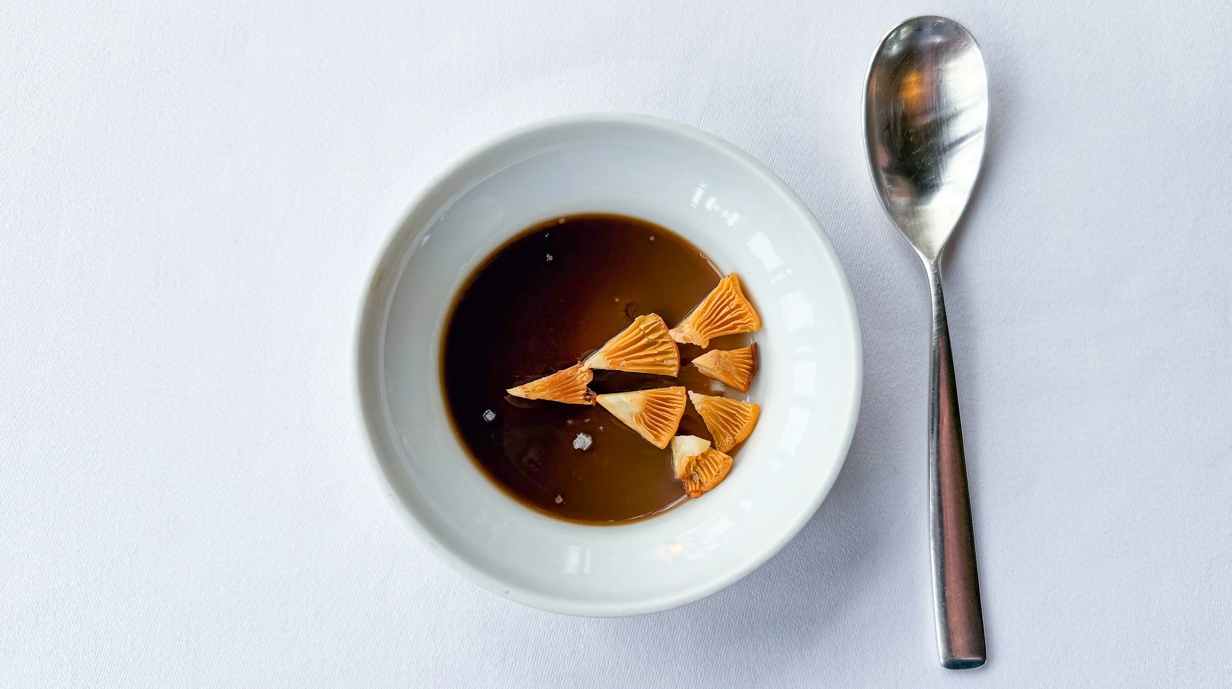 Der erste Aufschlag aus Allénos Küche ist eine Variation um Pfifferlinge. Makellos präparierte, goldgelbe Stücke liegen auf einem spiegelglatten Pilz-Gelée und einer seidigen Pilz-Royale. Optisch ist das ebenso reizvoll wie der Geschmack: intensiv waldig, mit Anklängen von feuchtem Laub und Unterholz. Einige grobe Kristalle Mandelsalz schneiden mit hellen, mineralischen Akzenten wie Lichtstrahlen durch den Wald. Die kühle Temperatur steigert dabei die Klarheit der Aromen. Das ist aufwühlend bildgewaltig und äußerst genussvoll. (10/10)