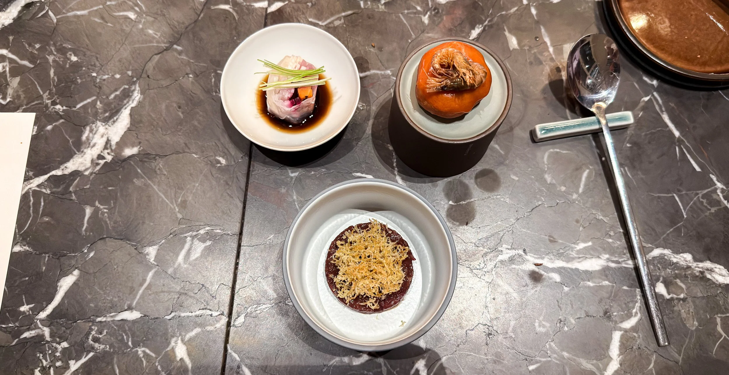 Als der nächste Gang den Tisch erreicht – erneut in drei Schälchen unterschiedlichen Inhalts – duftet alles nach deftiger, köstlicher Hausmannskost. Es gibt eine Art Eintopf mit Ochsenschwanz, Püree aus Limabohnen sowie Kohlrabi und Apfel in kleinen Stücken. Wärme, Säure, Salz und Umami: Ein solches Gericht ist pures Soulfood. Man hätte es allerdings nicht so abkühlen lassen, sondern Hitze zu einer zentralen Zutat machen sollen. Doch auch lauwarm ist das überzeugend. Dazu wird noch ein Schälchen (etwas zu trockener) Reis unter einem Cracker aus karamellisiertem Reis serviert. Reis passt gut zu dem Eintopf, doch die zu geringe Serviertemperatur macht sich auch hier bemerkbar. Fast übersehen hätte ich das dazu servierte Schälchen mit Tomatenwasser – erfrischend. Eigentlich sehr gut, aber technisch optimierbar. (6,9/10)