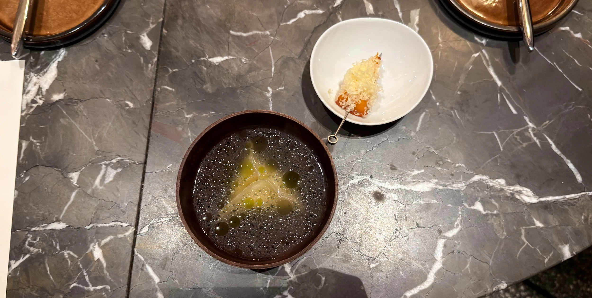 Der erste Menügang ist eine dekonstruierte jamaikanische Hühnerfußsuppe. Ein Schälchen enthält eine an Dashi erinnernde Bouillon mit einem Hühnchenknödel, daneben liegt ein Stück geschmolzener Kürbis mit gehobeltem Käse. Ob das Konzept einer Dekonstruktion kulinarisch stimmiger ist, als das Original »in richtig gut« zu erleben, fragt man sich angesichts der deutlich verhaltenen Aromen. Die Brühe ist am oberen Bereich der Salzgrenze, aber aromatisch blass; das Umami, das einem dort fehlt, findet man dann im Käse auf dem Spieß wieder, dazu etwas Süße im Kürbis. Außer diesen drei Grundgeschmacksrichtungen passiert hier nicht allzu viel. (6,5/10)