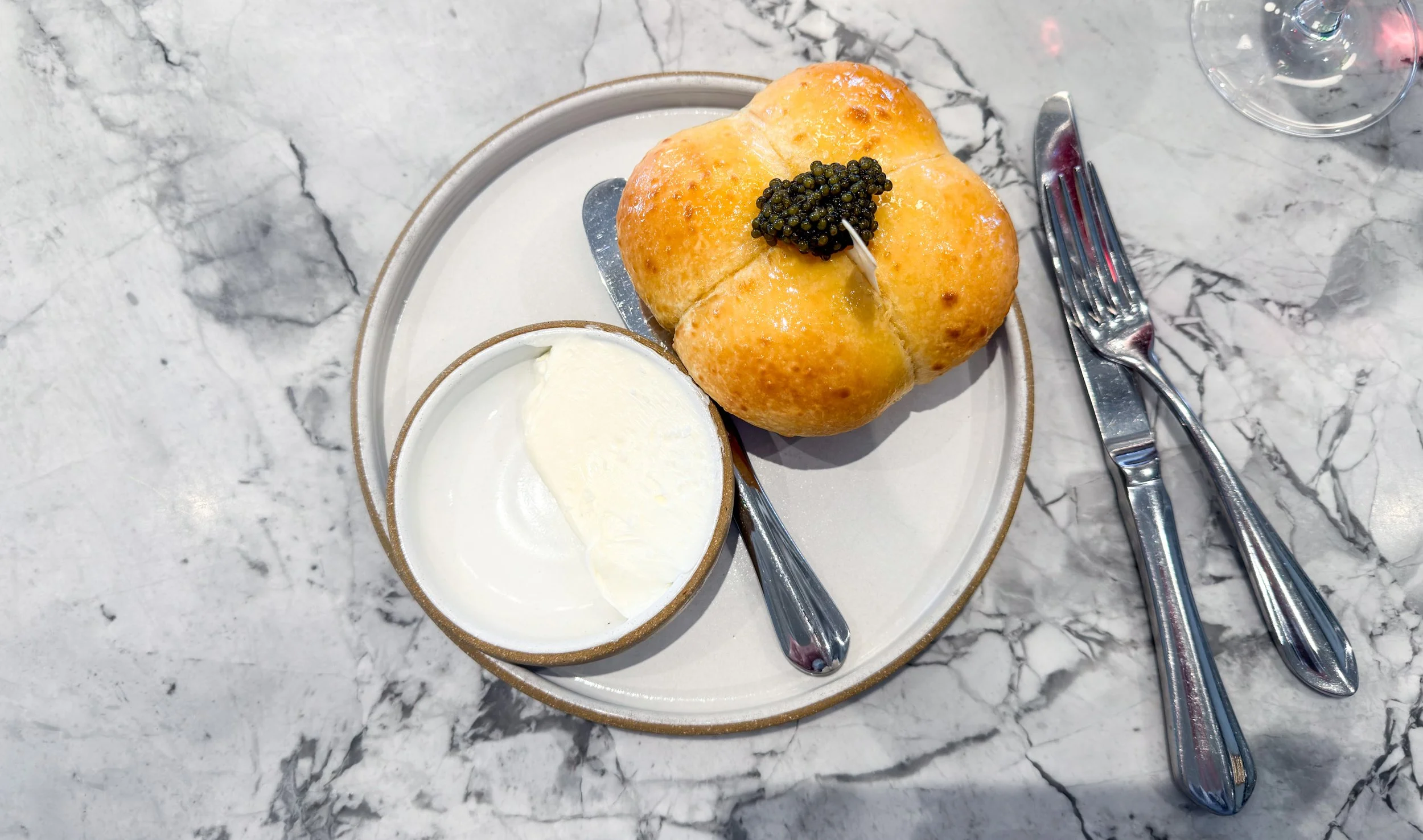 Womit weitermachen? Die „Hawaiian Rolls“ (8 $) klingen gut, gerne auch mit der optionalen Portion »Regiis Ova«-Kaviar (zzgl. 35 $), der Marke von Thomas Keller. Das fluffige Brötchen ist mit Ananas-Schweinefett aromatisiert, macht klebrige Hände und schmeckt wie eine nicht ganz so süße Brioche: wolkig, luftig, fettig, besonders in Kombination mit der hausgemachten Butter. Etwas mehr Kaviar hätte es allerdings sein dürfen ‒ die kleine Messerspitze trägt kaum etwas Nennenswertes bei. Das ist sehr gut, keine Frage, aber der üppige Snack eignet sich eher zum Teilen oder als Begleiter des Mahls. (7/10)