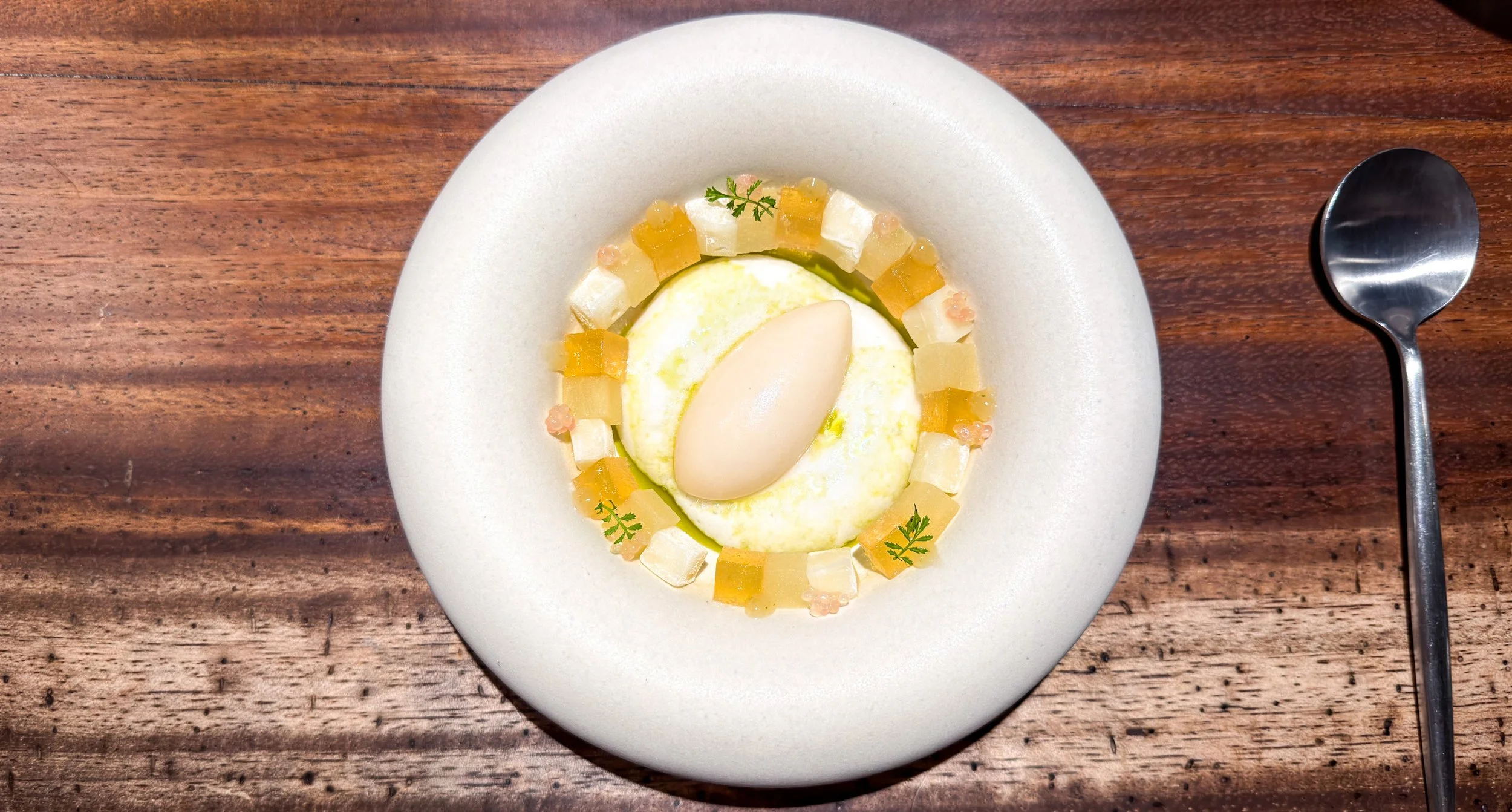 Ein »Clam Chowder«-Chawanmushi mit Muscheln, N25-Kaviar, feinen weißen Spargelfäden und einer Velouté aus fermentiertem Spargel präsentiert sich warm, salzig und elegant maritim. Aromatisch erinnert das nur lose an den Ostküstenklassiker; bei allem Genuss fehlt mir jedoch etwas von jener geschmacklichen Tiefe, die die Komposition zu versprechen scheint. Dennoch ist das ein stimmiges, fein austariertes Gericht, das ich genüsslich auslöffle. (7,5/10)