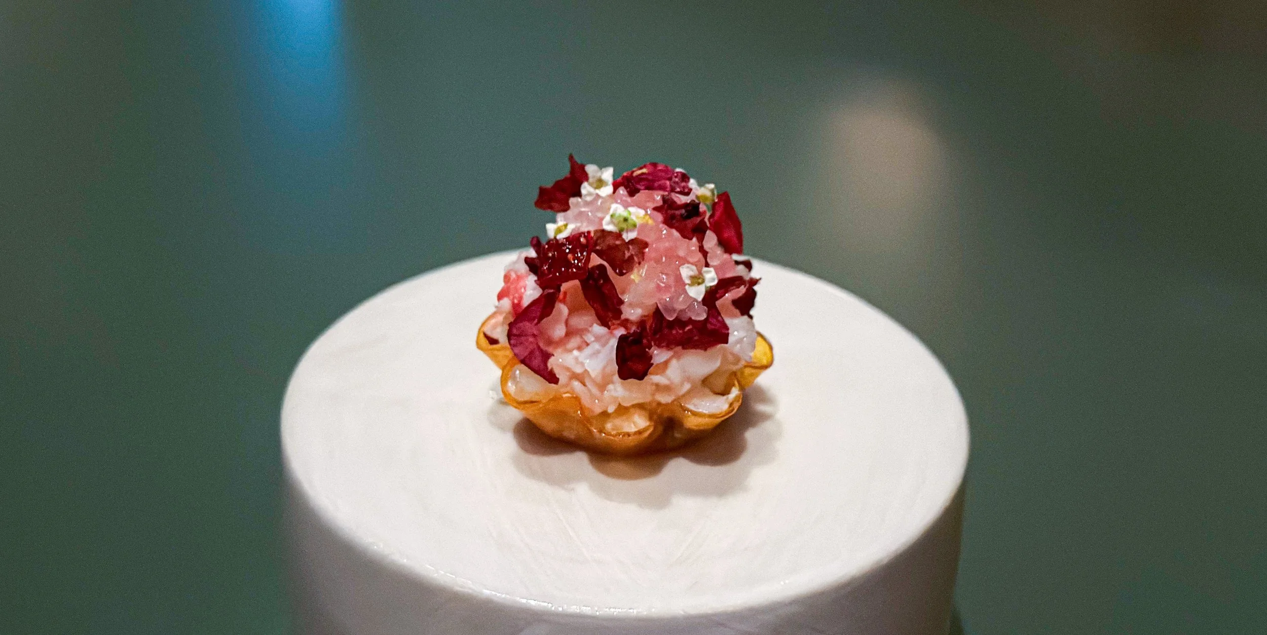 Zu einem weiteren Glas des kalifornischen Chardonnays gibt es zunächst ein Stück Musk-Melone aus Shizuoka ‒ saftig, aromatisch und süß ‒, gewürzt mit Sancho-Pfeffer und Limette sowie eine halbe Amaou-Erdbeere aus Fukuoka, die behutsam mit Earl-Grey-Honig-Essig und Blüten aromatisiert wurde. Die kleinen Twists, die die überirdischen Früchte ausstatten, heben sie in noch ungeahntere Genusssphären. Es werden einem hier am laufenden Band regelrecht überirdische Referenzqualitäten präsentiert. Es ist eine andere Welt! (10/10)