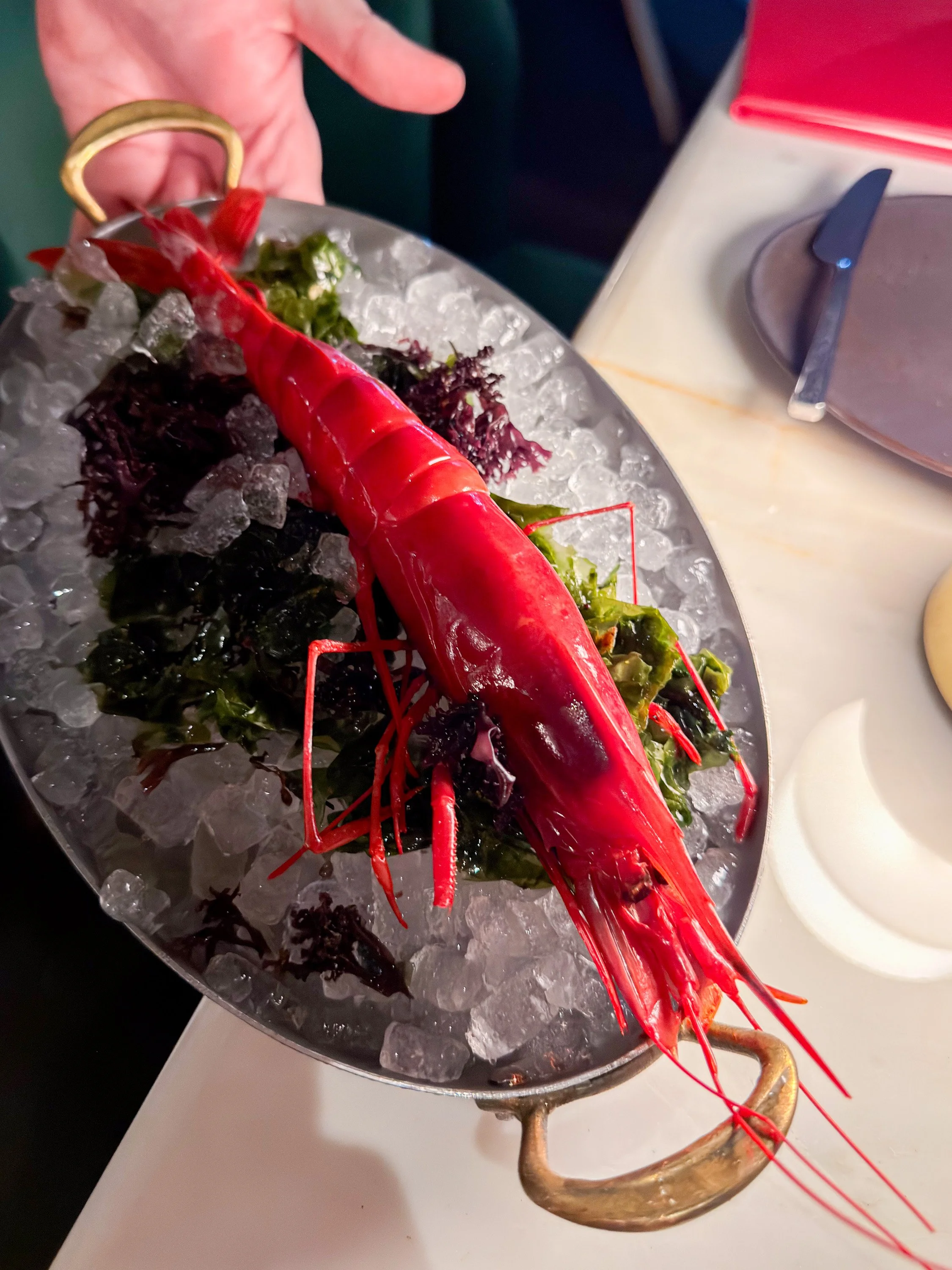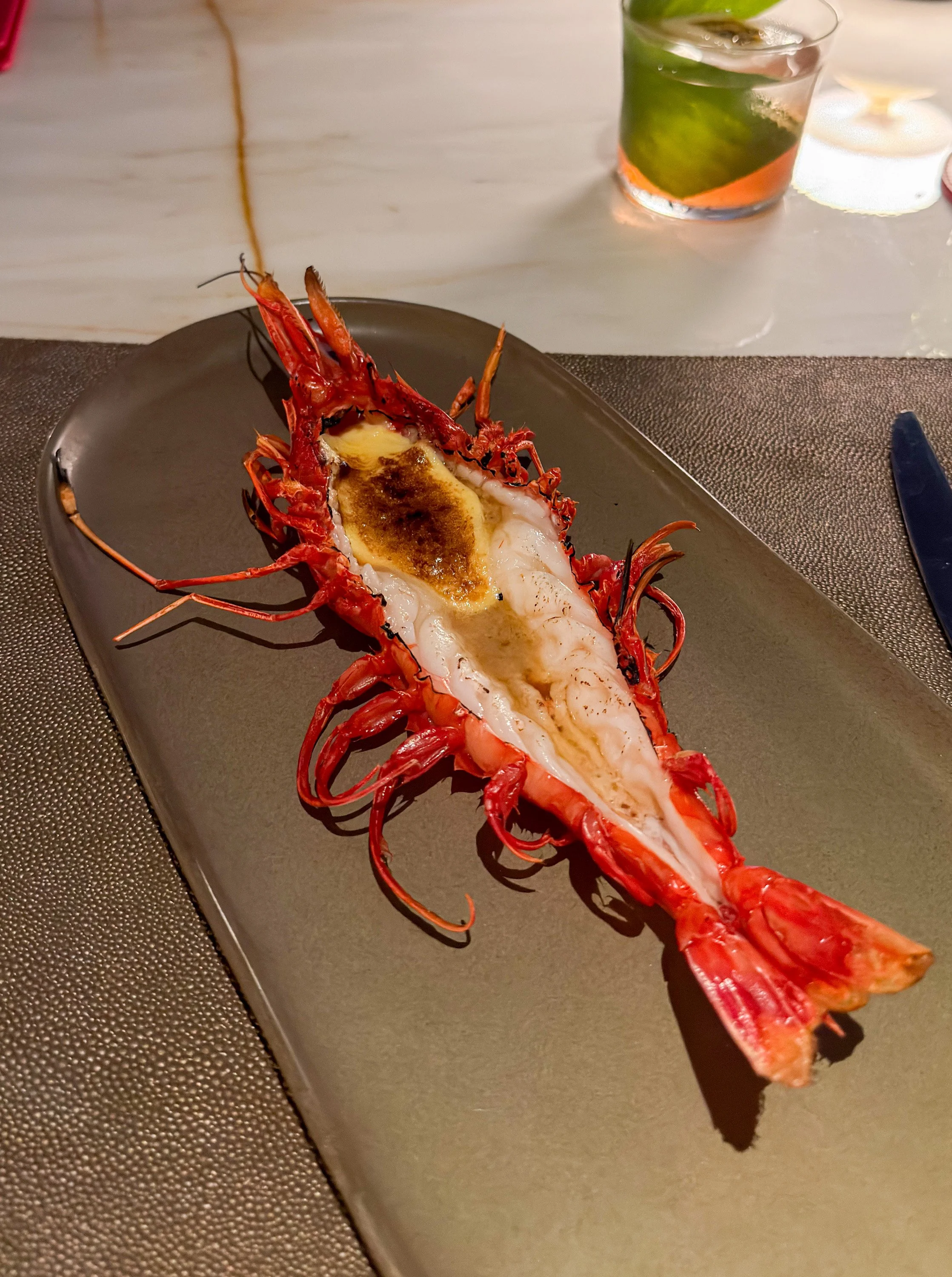 Ich komme jetzt erst richtig in Fahrt ‒ das ist alles begeisternd gut! Nur zu gerne darf es daher mit dem spanischen Carabinero weitergehen, gegrillt über Holzkohle und serviert mit ‒ aber nicht erschlagen davon ‒ einer Hollandaise. Die Ausnahmezutat, die in der hier servierten Qualität jeden Kaisergranat und Hummer in den Schatten stellt, zeigt sich hier mit intensiver Umamitiefe, maritimer Konzentration und dichter, saftiger Textur. Eine solche Referenzzutat genießt man sonst eigentlich nur im Baskenland. Sie ist jeden der umgerechnet ca. 88 € wert, die für das abgewogene Krustentier später auf der Rechnung stehen. (8/10)
