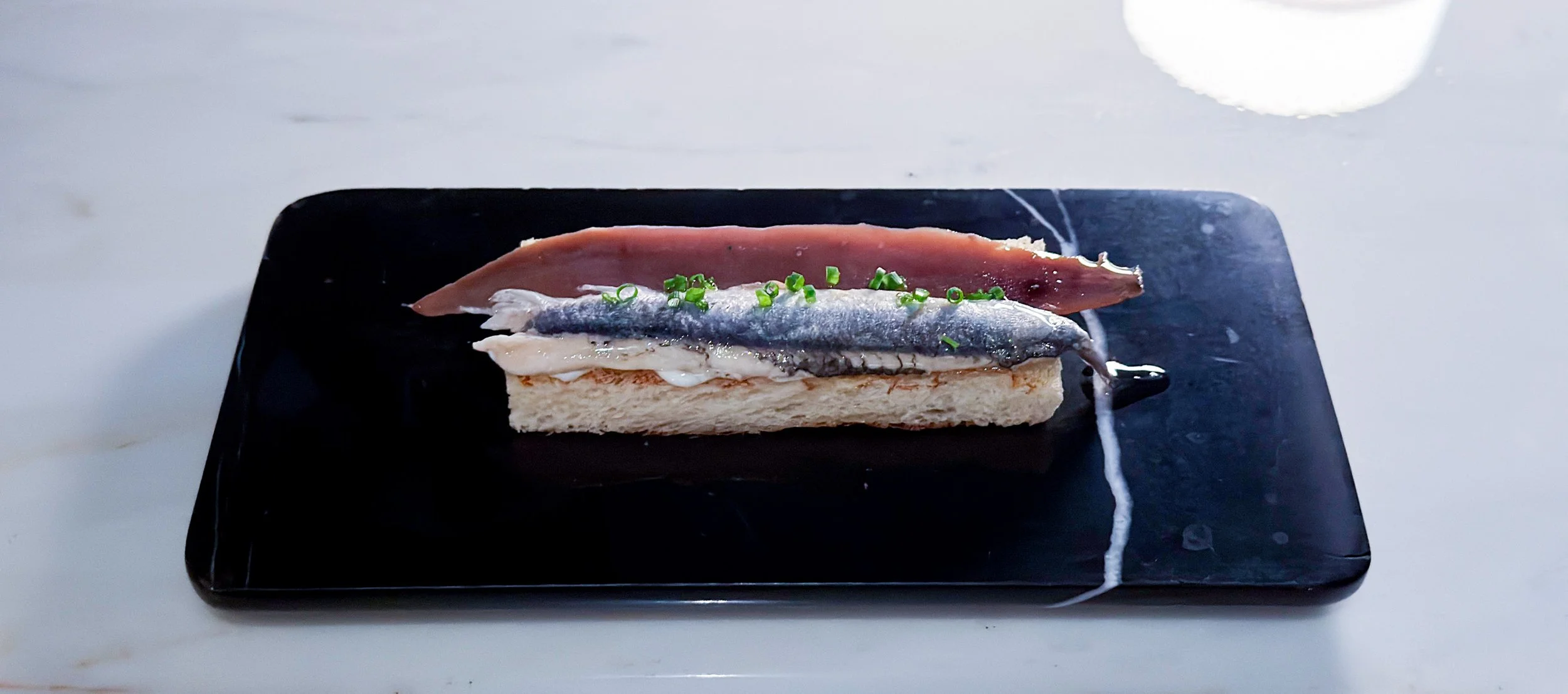 Ebenfalls auf einem Brioche-Toast wird ein Duo von marinierter und gesalzener Sardelle serviert (»Matrimonio«, ca. 7 €). Auch hier liegt der Fisch auf Stracciatella, doch im direkten Vergleich wirkt dieser Snack deutlich stringenter als der vorherige. Die umamitiefen, salzigen Aromen der Sardellen, frisch akzentuiert durch etwas Schnittlauch, besitzen eine bestechende Authentizität. Zudem ist das Brioche-Toast hier besser proportioniert. Eigentlich ist das zum Nachbestellen gut, doch die teiglastigen Snacks bringen auch eine »leichte Schwere« mit sich. (7/10)
