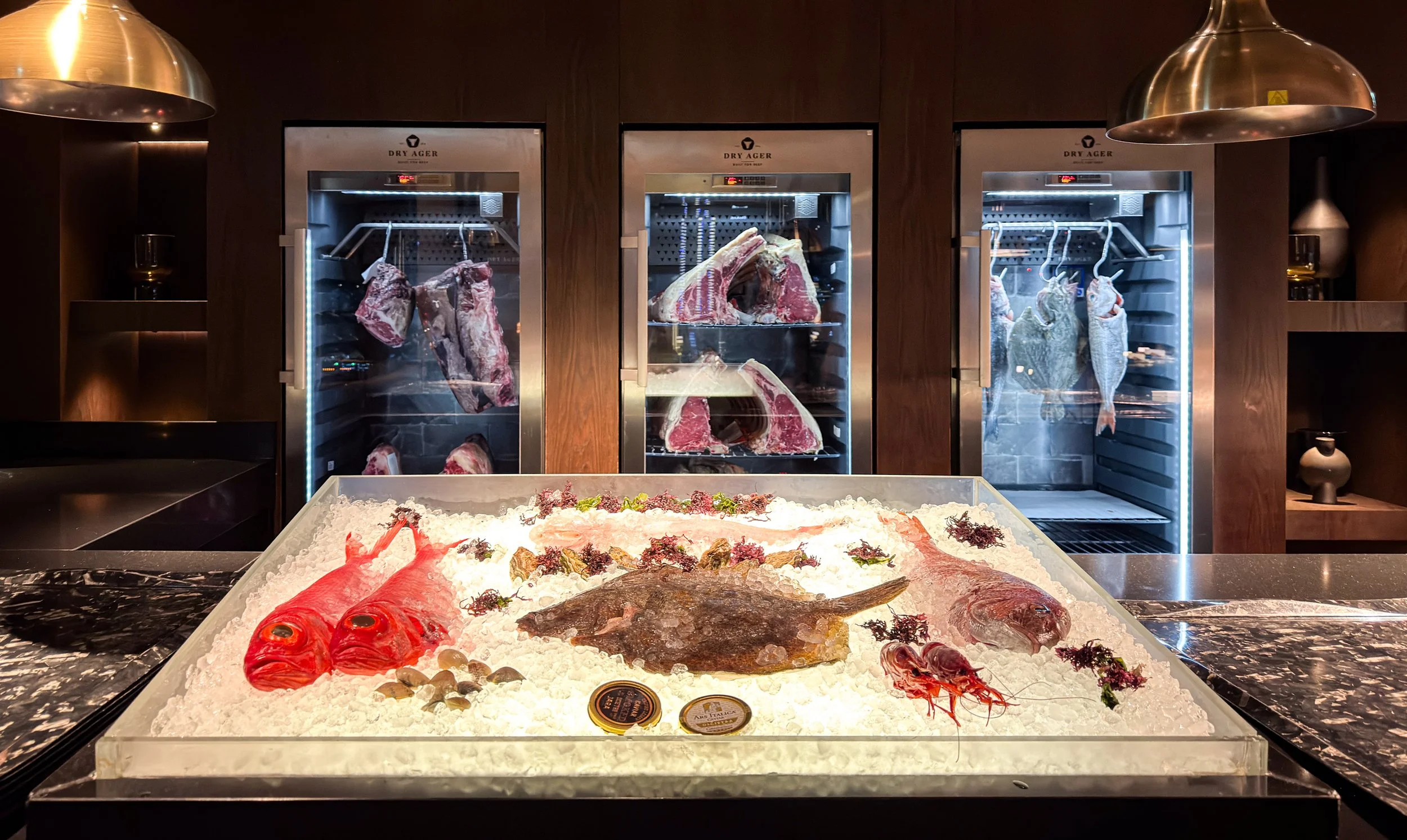 Edler, auf Eis gekühlter Fisch (Alfonsino! Baby-Steinbutt!) und Fleisch im Dry Ager von sichtlich hoher Qualität machen gleich beim Reinkommen Appetit.
