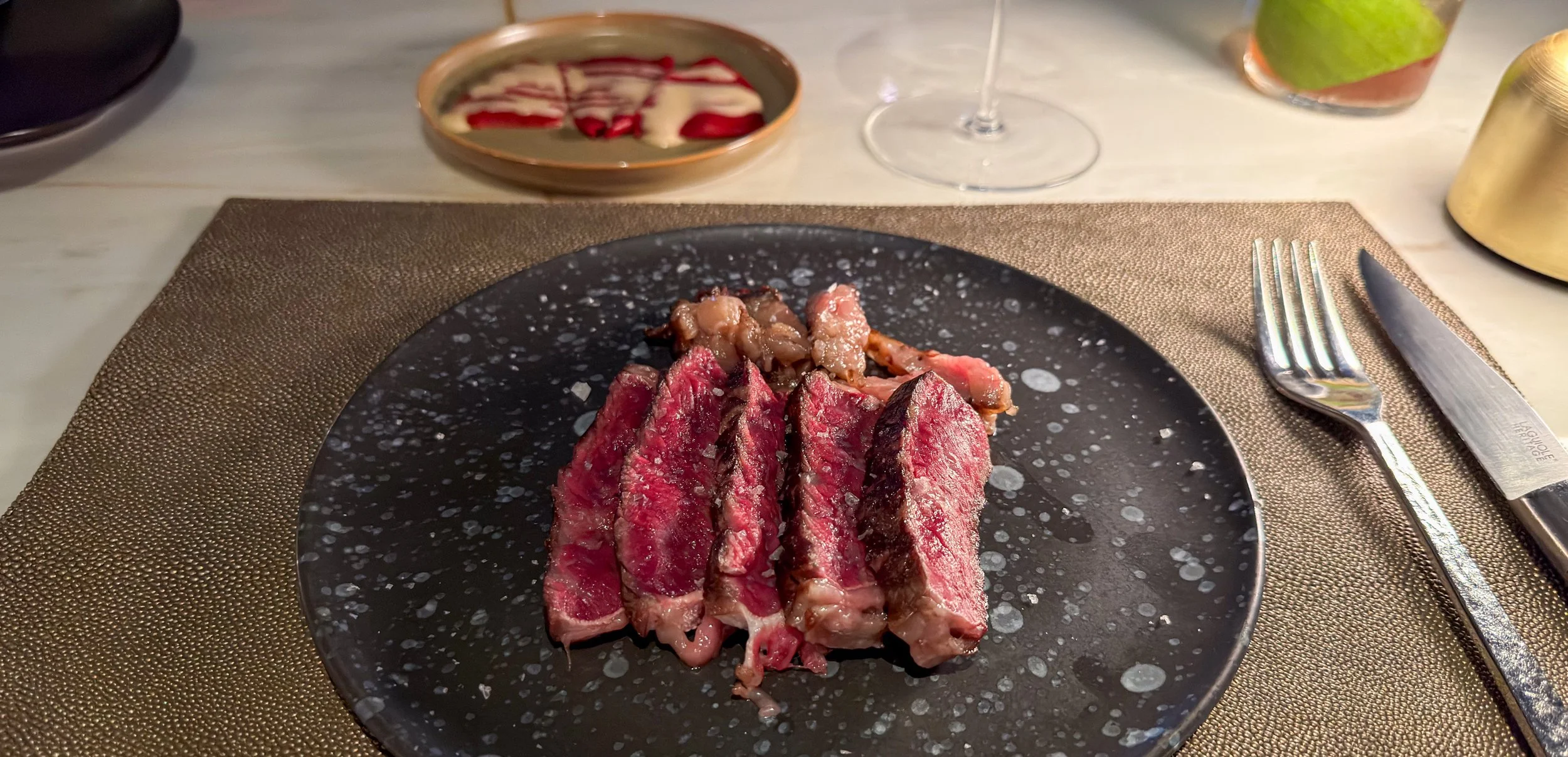 Das Fett schmilzt am Gaumen wie warme Butter; ich koste es einmal pur, dann wieder zusammen mit dem Fleisch. Geräucherte Piquillo-Paprika dienen als klassische, würzig-erdige Beilage. Eines der besten Steaks, die ich in diesem Jahr gegessen habe. (8/10)