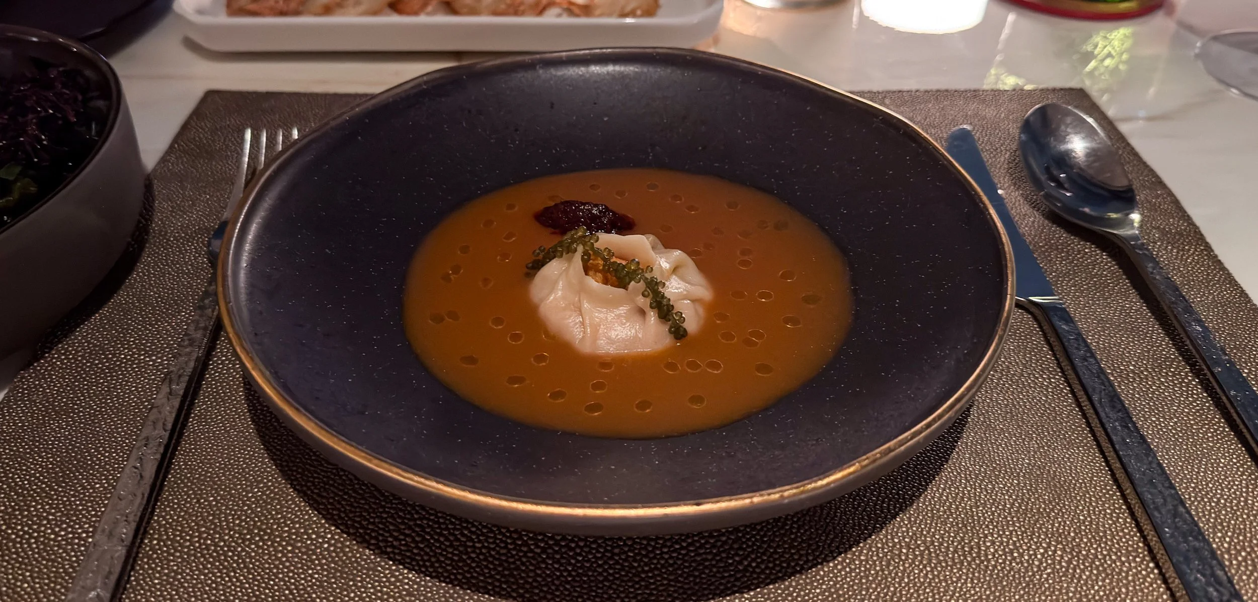 Teil zwei des Gerichts ist ein mit Txangurro gefüllter Dumpling, der in einer diesmal asiatisch inspirierten Brühe mit Zitronengras und pikantem Nam Phrik Phao zieht. Auch das ist hervorragend und der fernöstliche Twist eine willkommene Abwechslung. (8/10)
