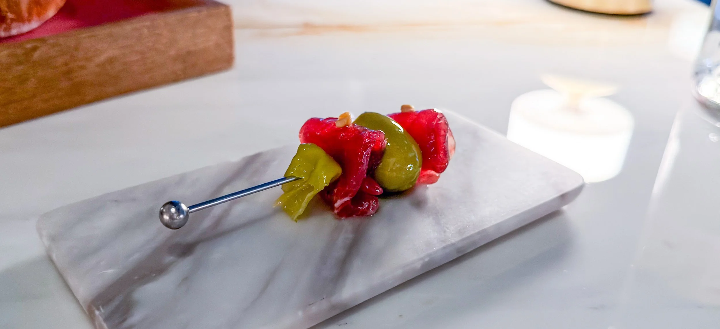 Erste Snacks erreichen den Tisch. Ein Gilda mit in Kombu mariniertem Blauflossen-Thun, mit Thunfischcreme gefüllter Gordal-Olive und Miso-Creme (ca. 14 €) reinterpretiert den klassischen Sardellen-Spieß aus San Sebastián mit einem etwas luxuriöseren Hauptdarsteller. Das ist sehr gut, mit köstlichem Schmelz und angenehmer Säure, aber der mildere Thunfisch kann es mit dem Salzkick des in jeder baskischen Pintxo-Bar auffindbaren Snack nicht aufnehmen. (7/10)