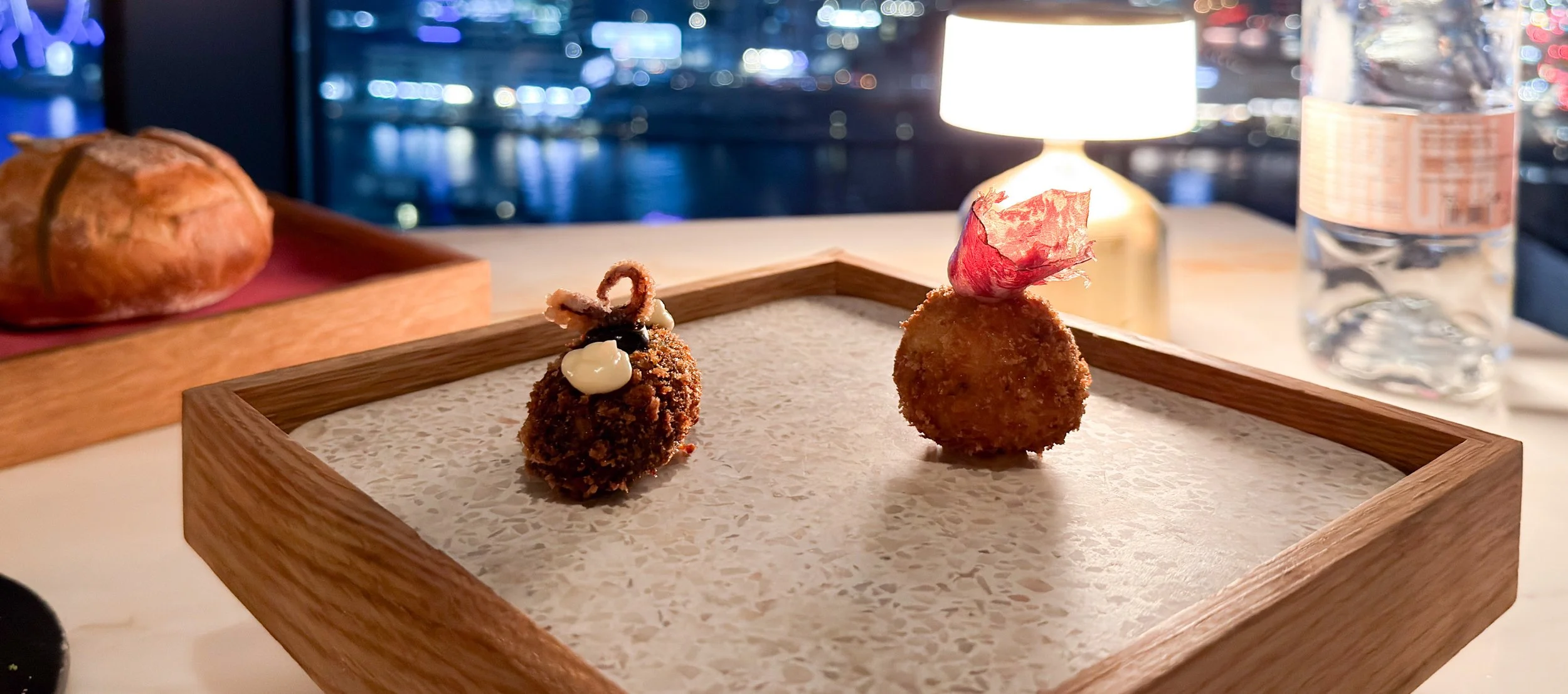 Zwei Kroketten (je ca. 8 €) halten das Niveau hoch. Die eine widmet sich Cecina, der luftgetrockneten Fleischspezialität, hier vom spanischen Wagyu ‒ die andere dem Thema Tintenfisch. In beiden Fällen findet sich die jeweilige Hauptzutat nicht nur in der cremigen Füllung, sondern auch als akzentuierendes Topping wieder. Die knusprigen Bällchen sind heiß, mit verführerisch knuspriger Hülle und bemerkenswerter Balance. (8/10)