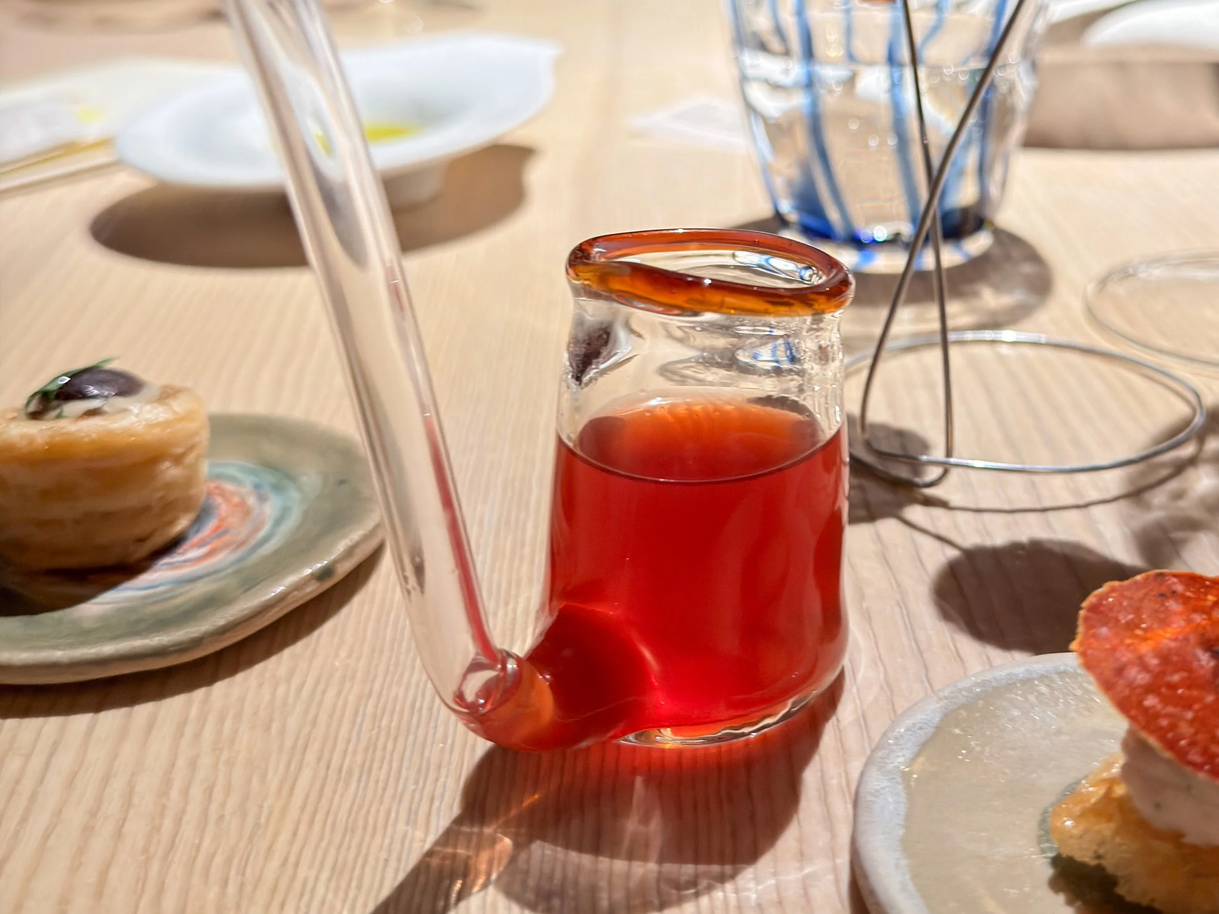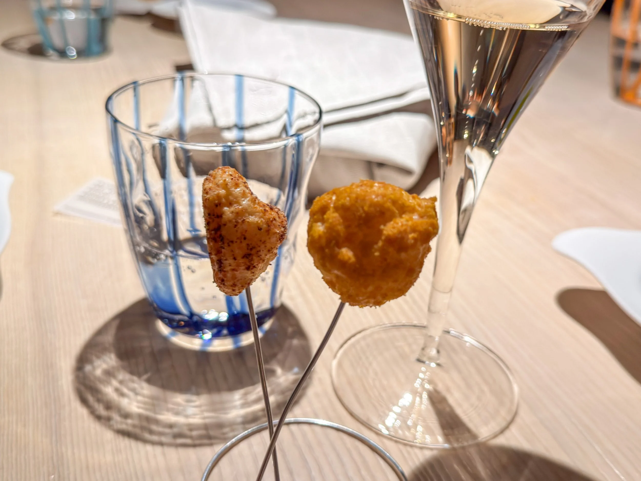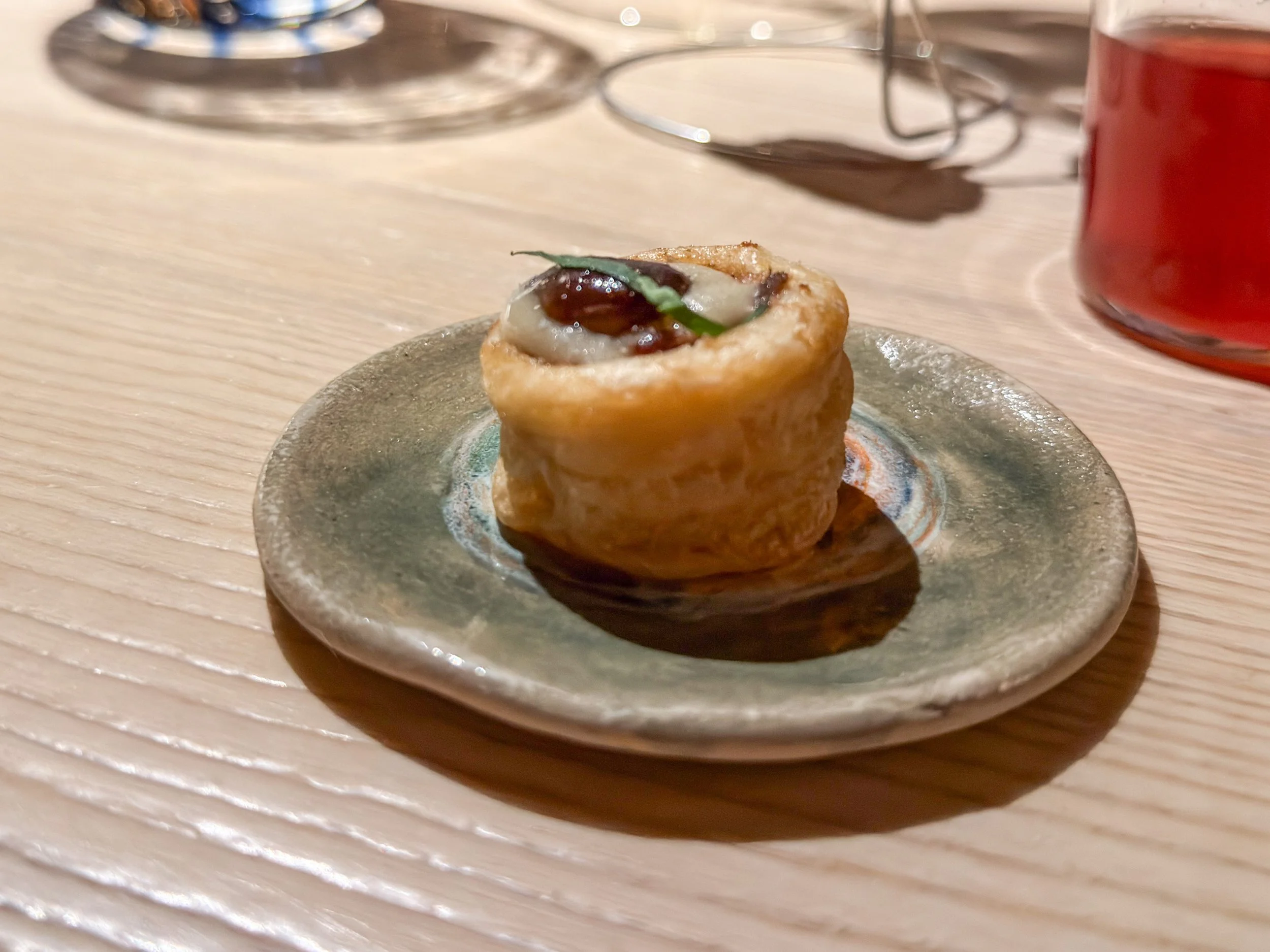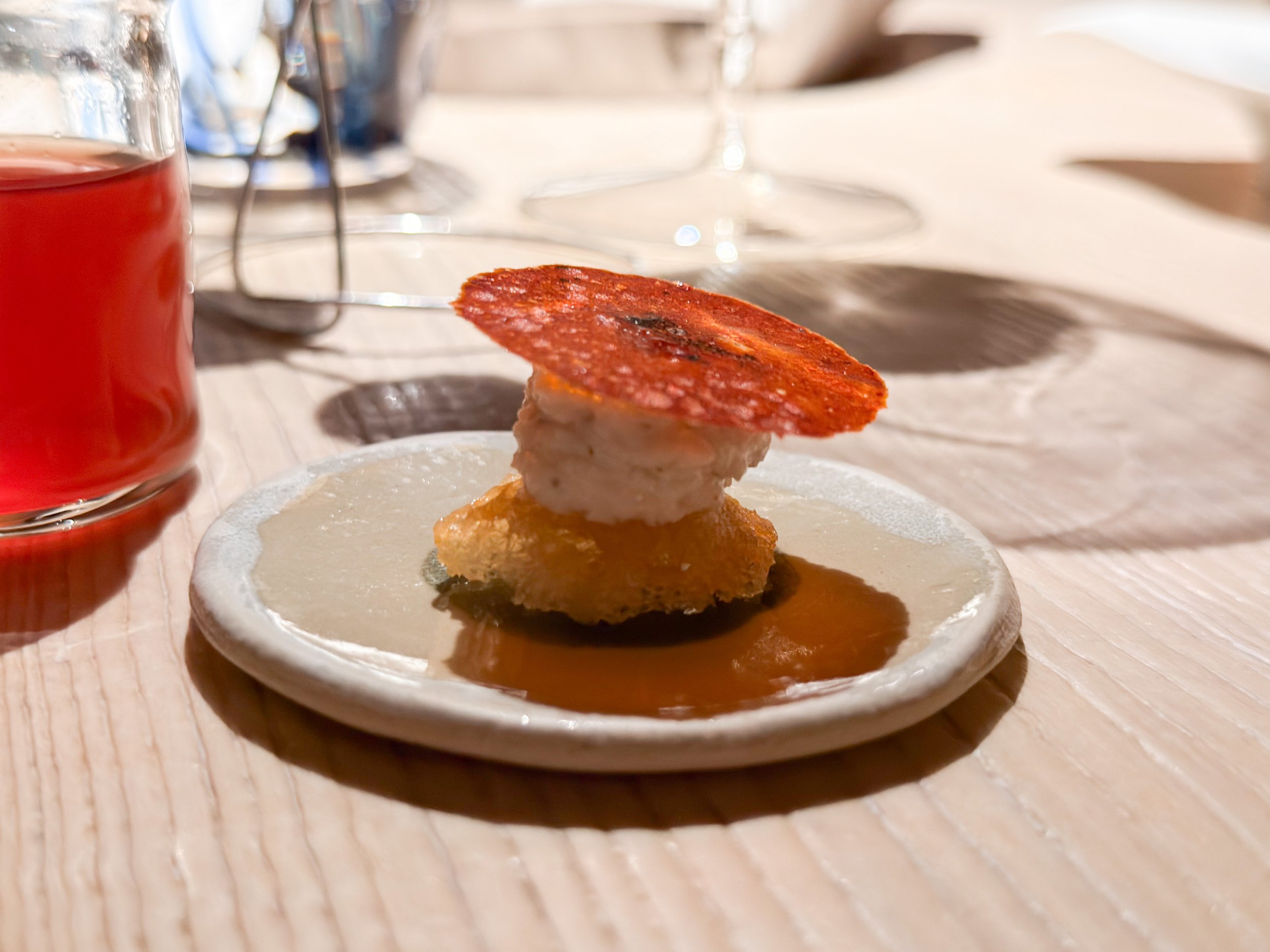 Dann werden die ersten Snacks auf dem Tisch angerichtet. Es gibt ein warmes Blätterteiggebäck mit Hase und Pilzen, die dem sehr französisch anmutenden Snack eine angenehm bissfeste Textur verleihen (8,5/10); dazu eine knusprige Olive mit Stockfischcreme, die sich unter einer »falschen Salami« aus ’Nduja und roter Paprika verbirgt – recht fettig, aber hervorragend, mit angenehm sommerlich-leichten Aromen (8/10).