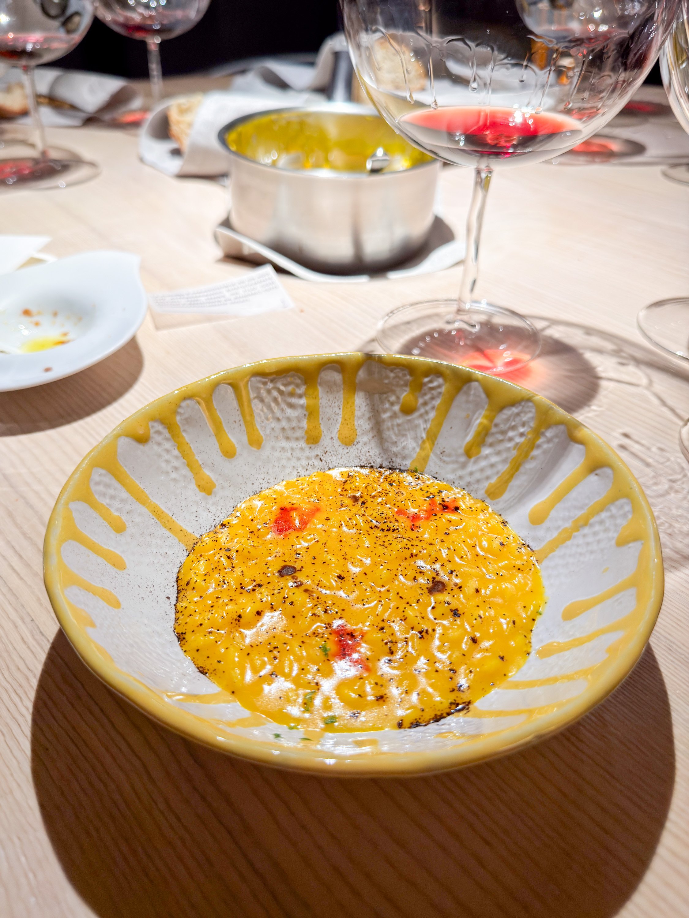Und dann, endlich – fast mein eigentliches Reiseziel – das berühmte Safran-Risotto, das sich bei mir so eingeprägt hat, dass es während der letzten zehn Jahre nicht selten auch bei mir zu Hause auf dem Tisch stand, dem vergleichsweise einfachen Rezept aus Alajmos Kochbuch sei Dank.