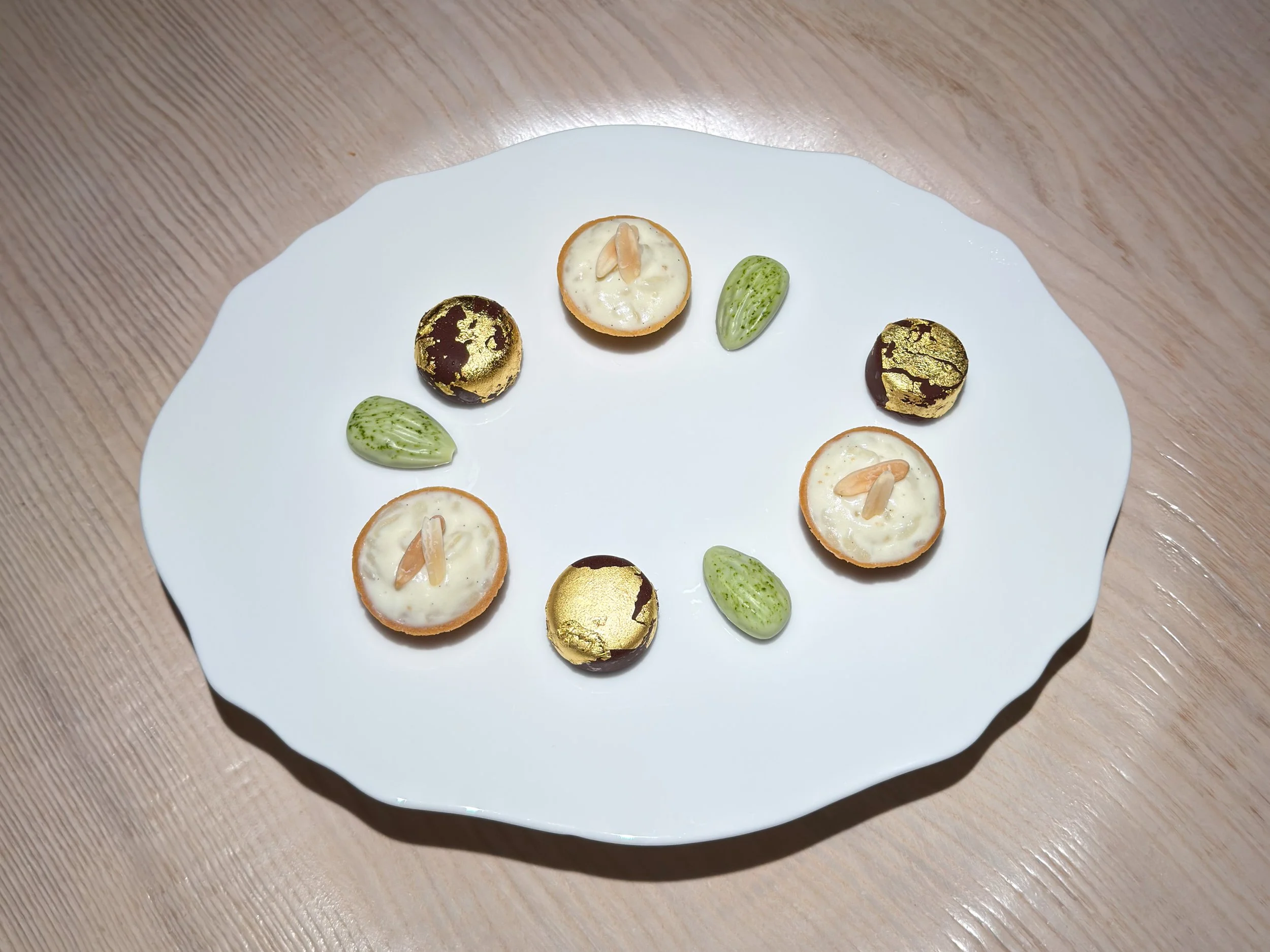 Nach einem kurzen Exkurs über eine einwandfreie Käseauswahl, folgen noch Pralinen: Reistörtchen mit Milch; Matcha-Praline; sowie ein flüssiger Gianduiotto mit Blattgold – ein himmlisch gutes Trio, das noch mal ein Ausrufezeichen hinter das Menü setzt. (9/10)