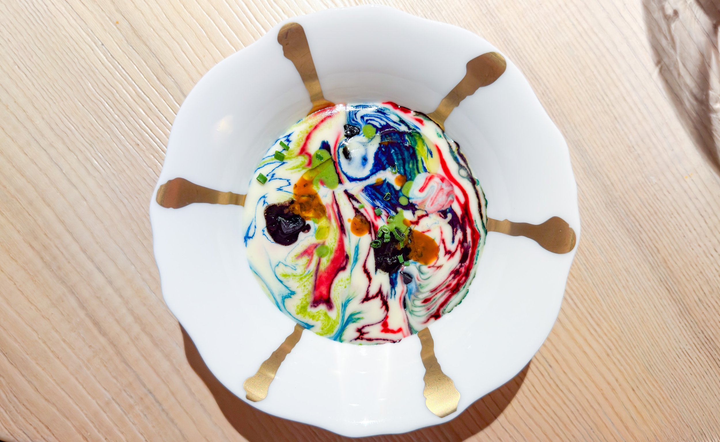 Das nächste Gericht – Murrina Cappuccino – ist visuell inspiriert von der Murano-Glaskunst aus Venedig und entsprechend farbenfroh. Im Wesentlichen handelt es sich hier um eine feine, luftige Kartoffelemulsion mit Tintenfisch und dessen Tinte, Rote-Bete-Reduktion, Seeigel, Spinat und Spirulina. Auch hier gelingt am Gaumen ein sehr balanciertes Geschmacksbild, mit maritimen Akzenten, fein abgemildert von der Kartoffelemulsion und angenehm warm. Das ist bemerkenswert wohltuend und harmonisch, nur als Produktliebhaber wird man auch hier nicht besonders glücklich. Dennoch geschmacklich mehr als hervorragend. (8,5/10)