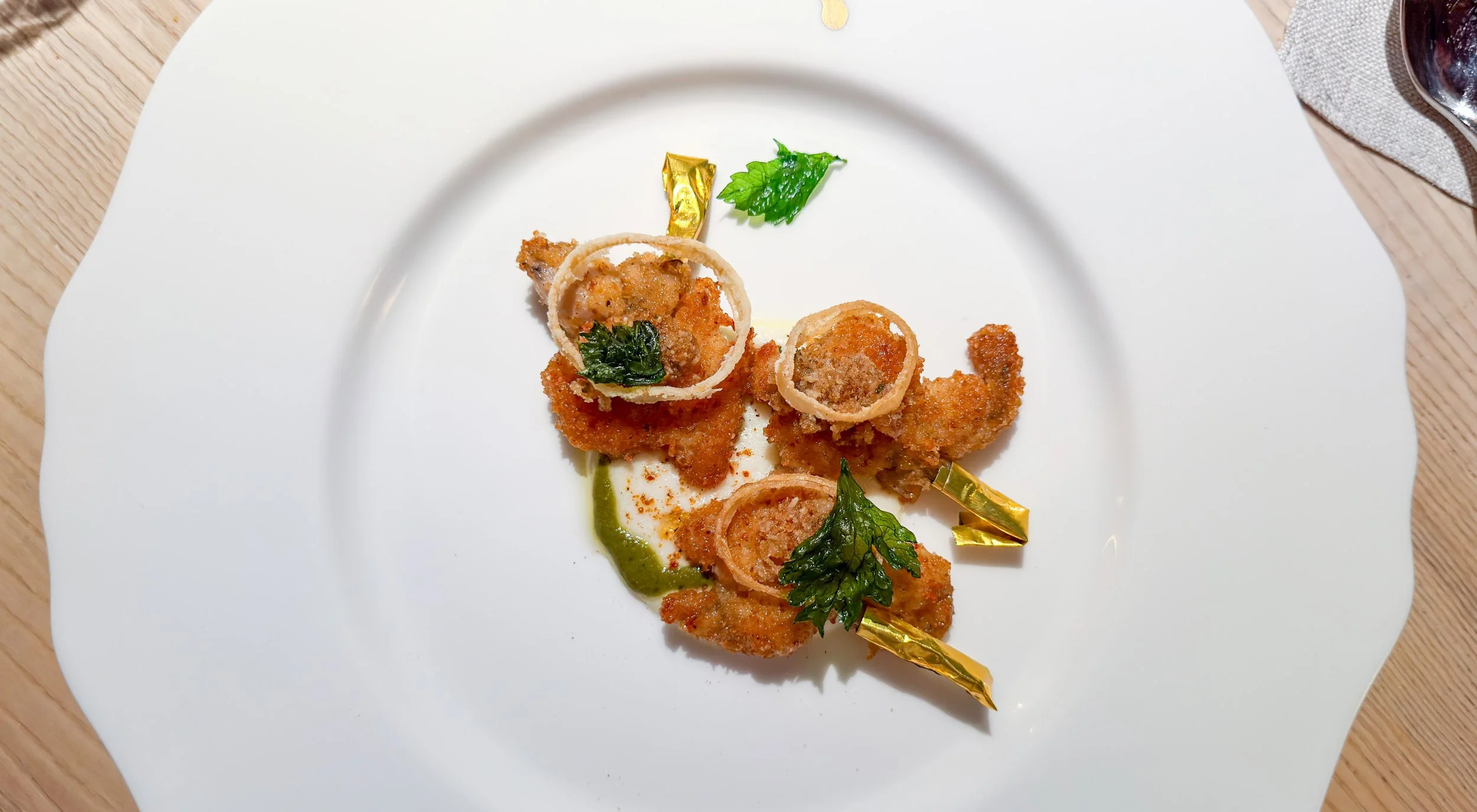 Es folgen Froschschenkel, gebraten in einer Panierung aus Brotkrumen, Petersilie und Knoblauch. Das Ergebnis sind saftig-zarte Fingersnacks, die mir eine Nuance zu fettig sind, was aber durch einen mit Zitrone aromatisierten Dip leicht aufgefangen wird. Das macht Spaß – nicht mehr, nicht weniger. (7/10)