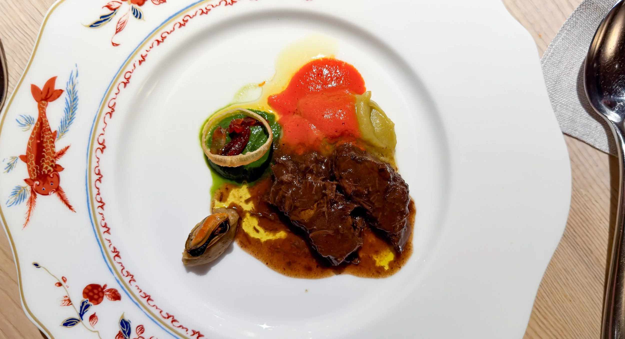 Schließlich: geschmorter Esel. Die Bestellung kostete mich etwas Überwindung – mir war nicht einmal bewusst, dass man Esel isst. In geschmorter Form wähnte ich mich jedoch auf der sicheren Seite. Serviert wird das Schmorfleisch mit diversen Pürees, unter anderem von Brokkoli, gebranntem Lauch und Chorizo. Auf einer Artischockencreme sitzt zudem eine kalte Muschel.