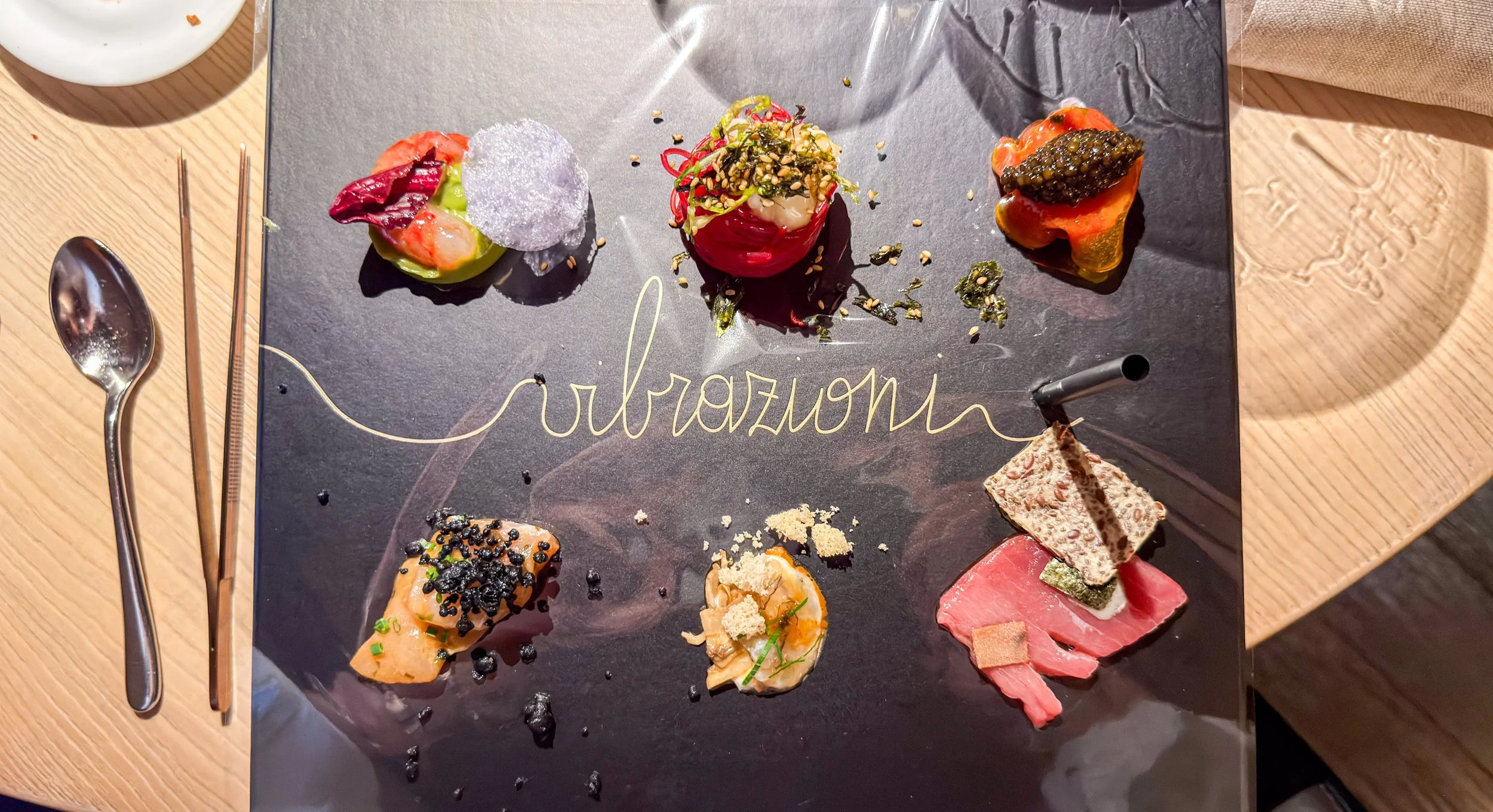 Das erste eigentliche Gericht, das den Tisch erreicht, hört auf den Namen Vibrazioni und ist eine Variation um rohes Seafood. Dass aus der Pappschachtel, auf der das Gericht serviert wird, Kopfhörer herausragen (hier nicht mehr im Bild), die man sich während des Essens ins Ohr stecken soll, befremdet mich gleich zu Beginn. Heston Blumenthals Sound of the sea war damals originell; dabei hätte die Kochwelt es dann belassen können – auch, wenn es hier um etwas anderes geht, nämlich das Verstärken der Geräusche auf dem »Teller«, die man als Gast selbst verursacht. Ich konzentriere mich lieber aufs Kulinarische.