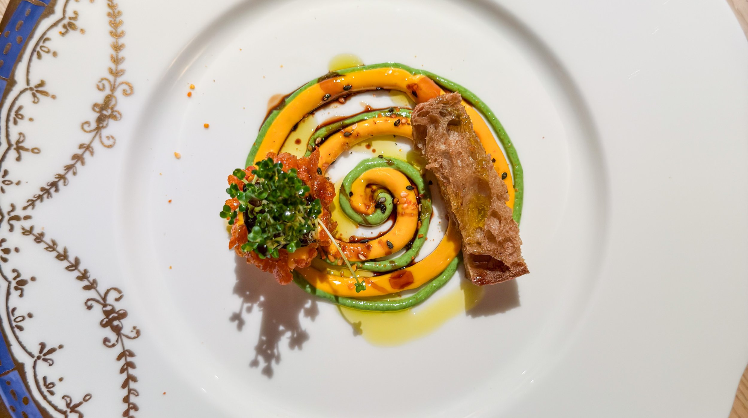 Es geht weiter mit »Scarpetta Buon…sai«. Sprossen aus der Familie der Kreuzblütler sind hier mitsamt ihrer essbaren Matrix serviert – ein weicher Boden, aus dem sie herauswachsen. Dazu gesellen sich verschiedene Saucen und Akzente, unter anderem Paprika- und Rucola-Cremes, Olivenöl sowie frittierte kleine Garnelen. Mit einem Stück geröstetem Brot versucht man sich dann an der Scarpetta, also dem »Auswischen« des Tellers, was mit der Sprossenkonstruktion nur mäßig gut gelingt.