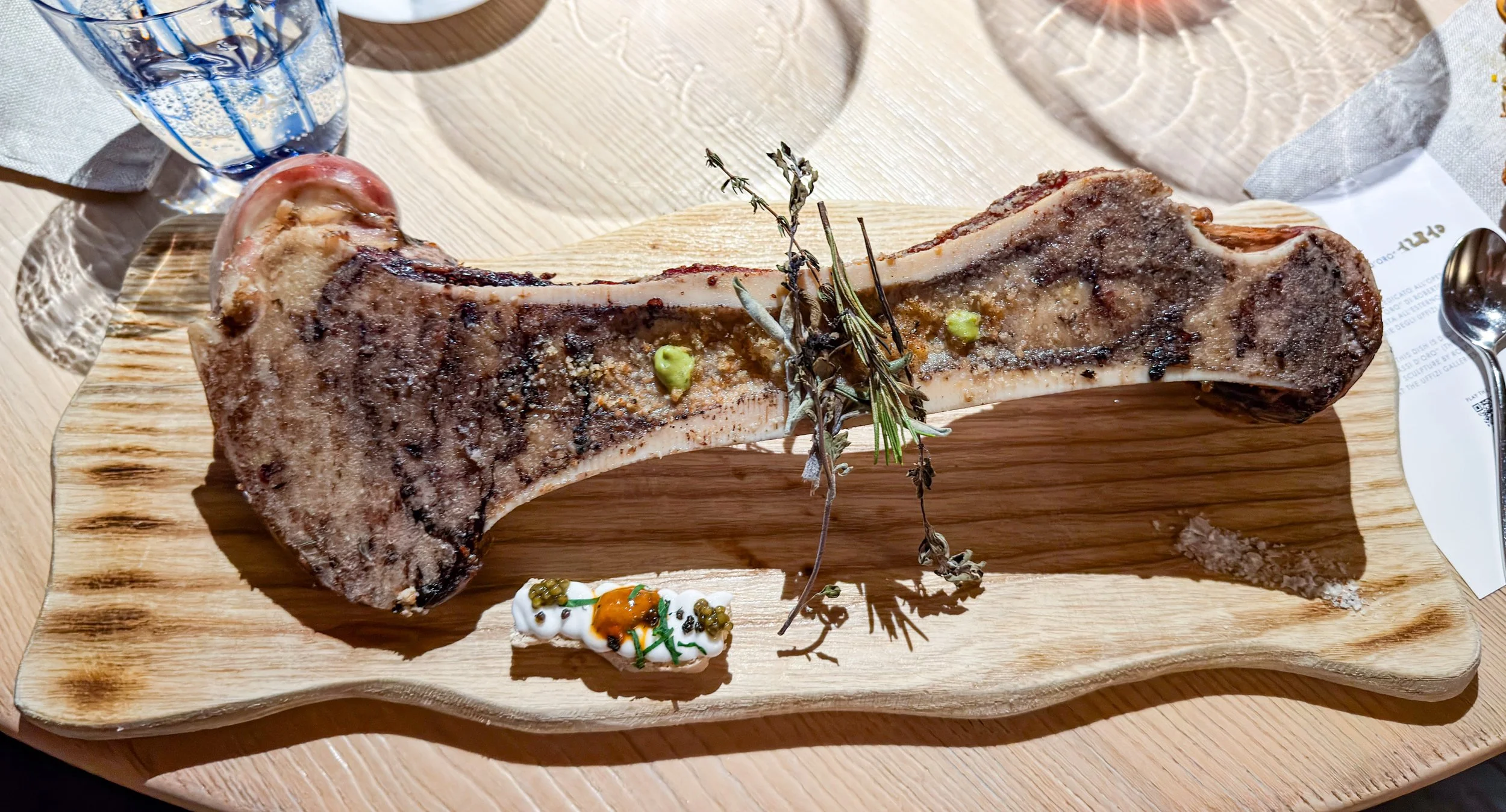 Zuerst gibt es einen längs aufgeschnittenen Oberschenkelknochen vom Fassona-Rind, der zusammen mit Brotkrumen im Ofen geröstet, mit einer Estragon-Senf-Creme und leicht versengten Kräutern serviert wird. Separat dazu kommt eine kleine, knusprige Bruschetta mit Petersilie, Seeigel und Osietra-Kaviar.